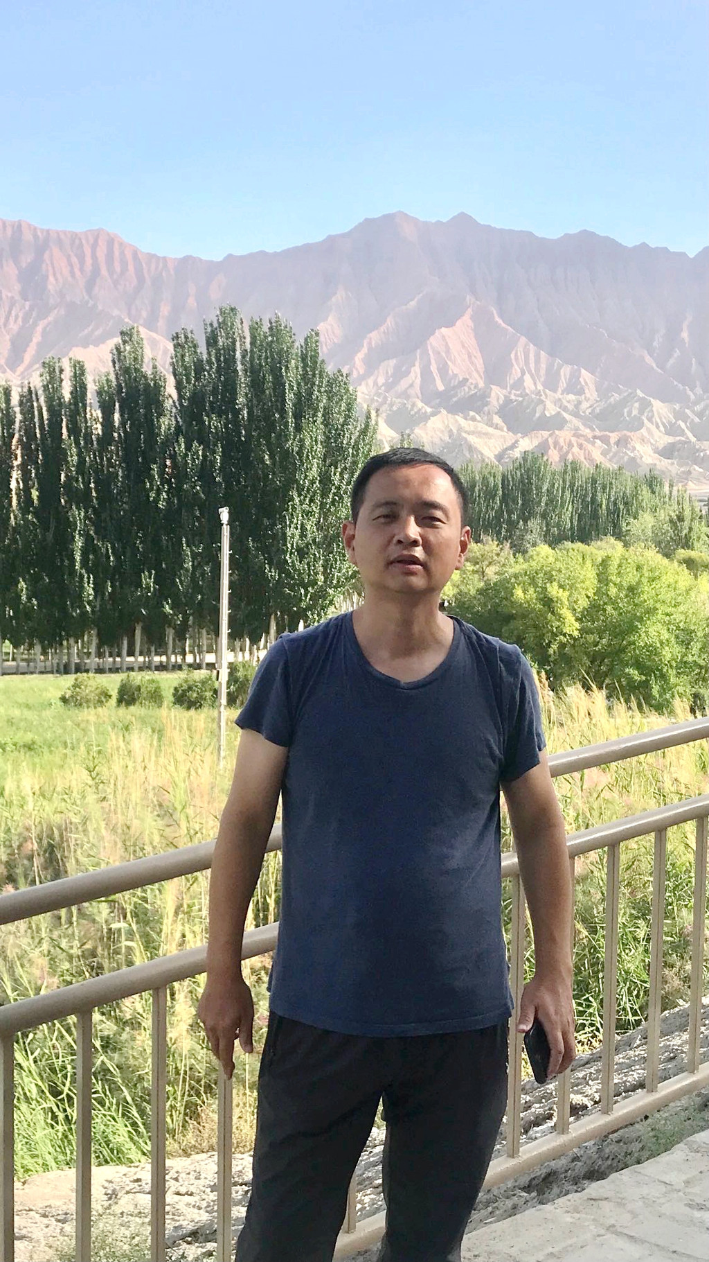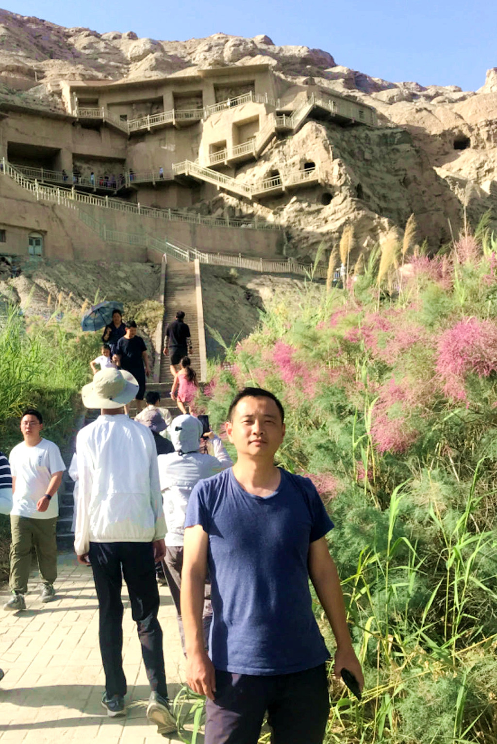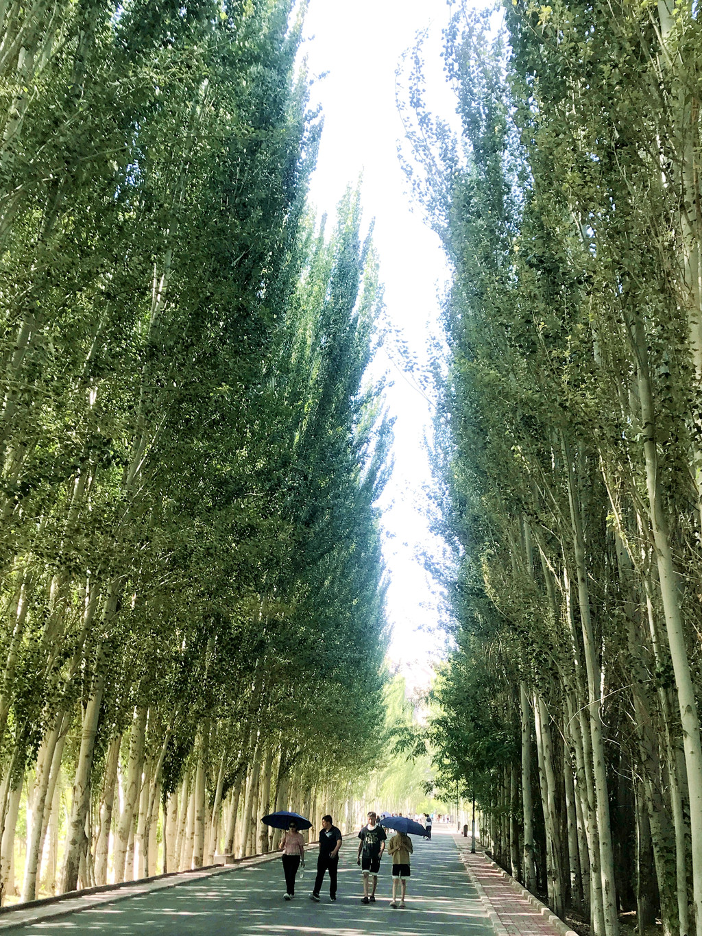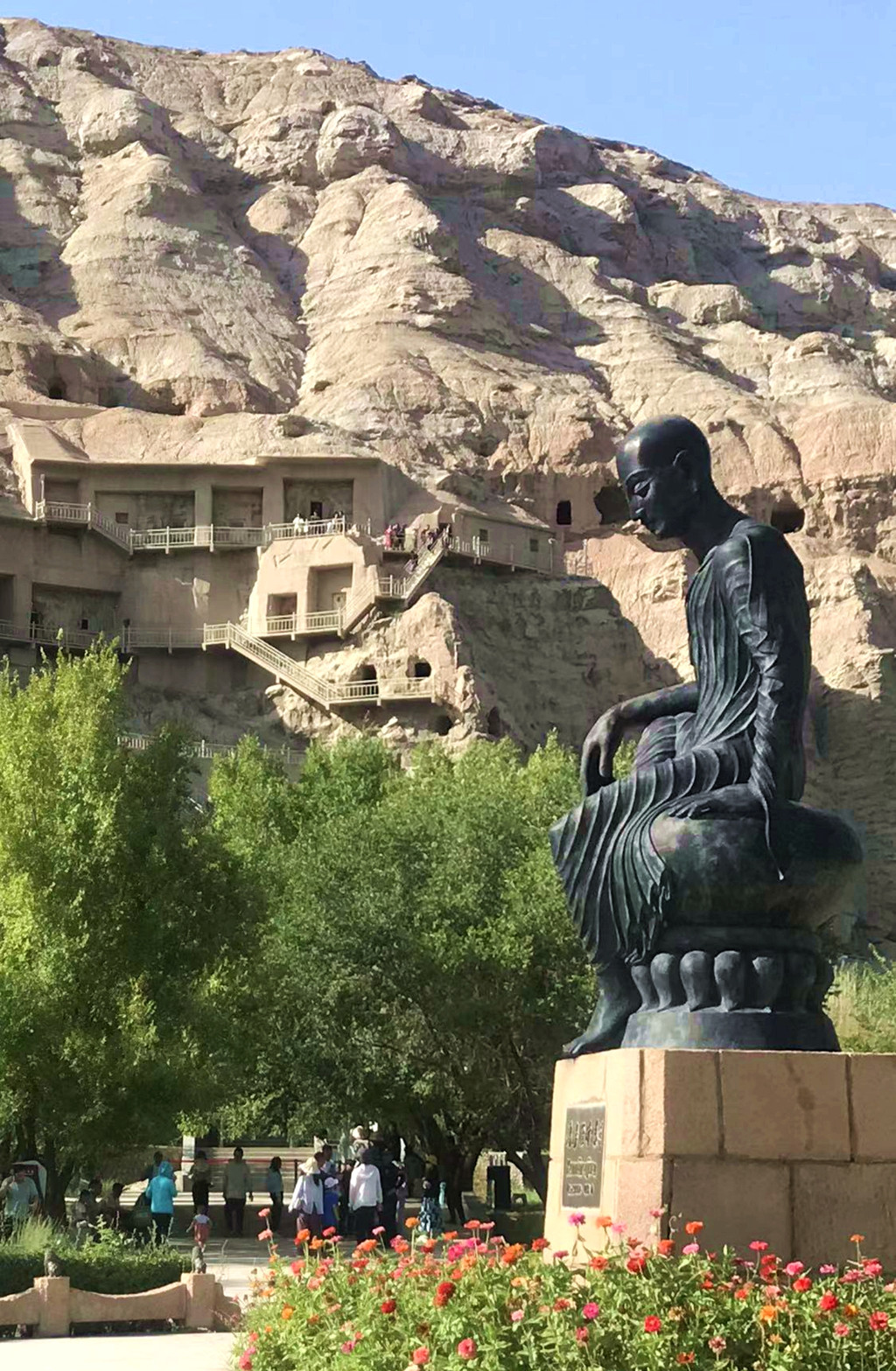 从景区停车场到真正的石窟区,还有徒步走很长距离,道路两旁都是高大的白杨。走到窟区附近,最醒目的标志就是那尊鸠摩罗什青铜塑像。鸠摩罗什是我国佛教历史上的重要人物,他的父亲原为天竺(古印度)贵族,来到龟兹后生下鸠摩罗什。鸠摩罗什九岁随母前往克什米尔学经,返回龟兹后成为西域著名高僧,后来又经河西走廊辗转来到内地长安,被尊为十六国时期“后秦”的国师。鸠摩罗什对于佛教传入中国内地曾有重大贡献,他也是中国汉传佛教四大佛经翻译家之一,一生翻译了35部,共294卷佛经。其中,如《妙法莲华经》《金刚经》等,都曾对中国佛教之发展产生过深远影响。