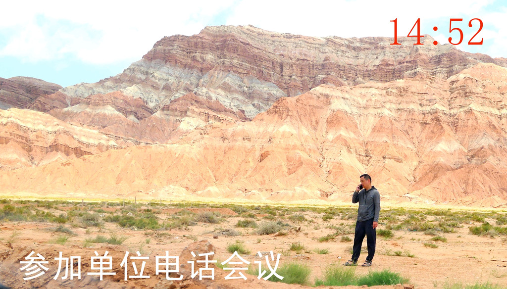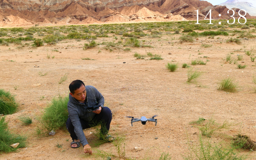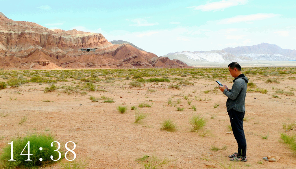 14:07再乘景区交通车,十多分钟后便重返景区游客中心。游客中心附设餐厅,但两人都说不饿,于是直奔停车场。找到汽车后也并没急着出发,因为X.J.的工作单位有电话会议,时间约定14:40。尚有些许时间,他又抓紧时间放飞了无人机,然后就是独自在戈壁滩上“开会”,我坐在汽车中等他。