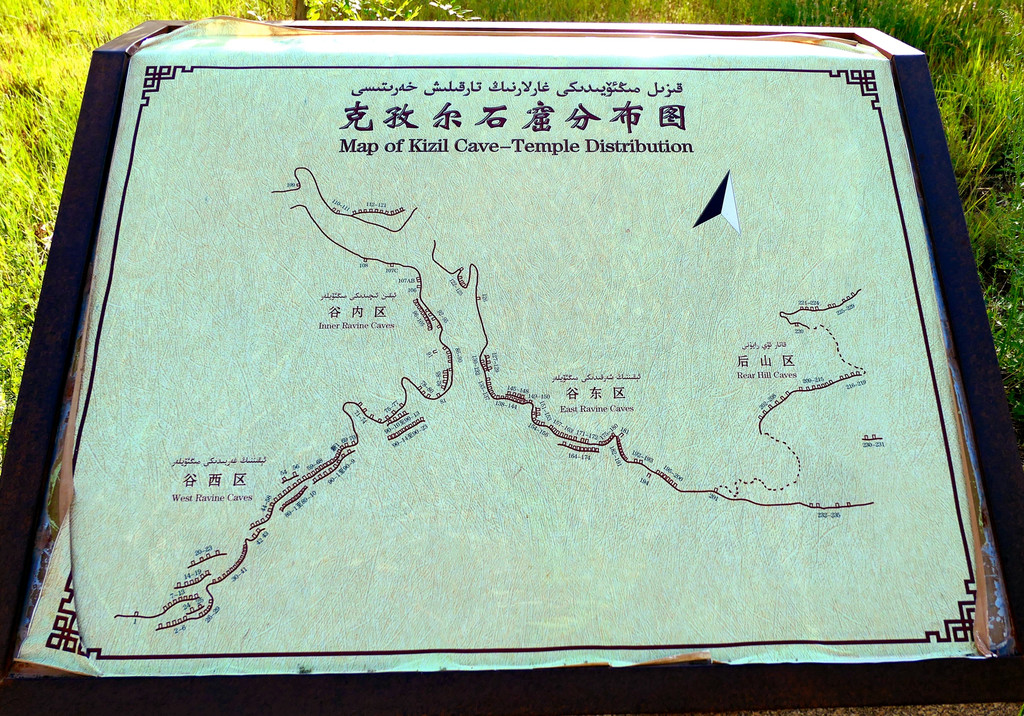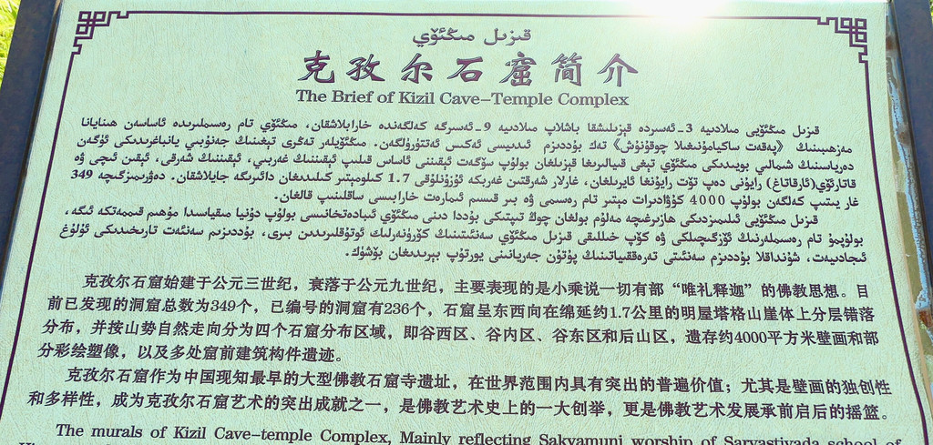 与克孜尔石窟群的整体规模相比,目前作为景区开放的洞窟仅为极少数,十余个洞窟集中分布在一座高台之上。我们跟随导游,先后参观了其中不到10窟。这里的洞窟远不如敦煌、大同以及龙门石窟那般宏伟,感觉就像是敦煌的“西千佛洞”。所有的洞窟都是袖珍型,壁画也跟敦煌西千佛洞类似,仅仅是些小小的佛像图案而已,远不如存包室内的那幅仿制品漂亮。唯一可取就是眼前所见都是两千年前的真迹,有着无可替代的历史文物价值。
