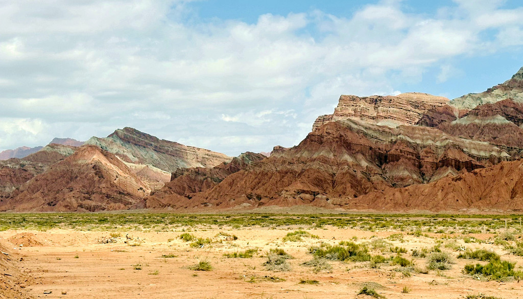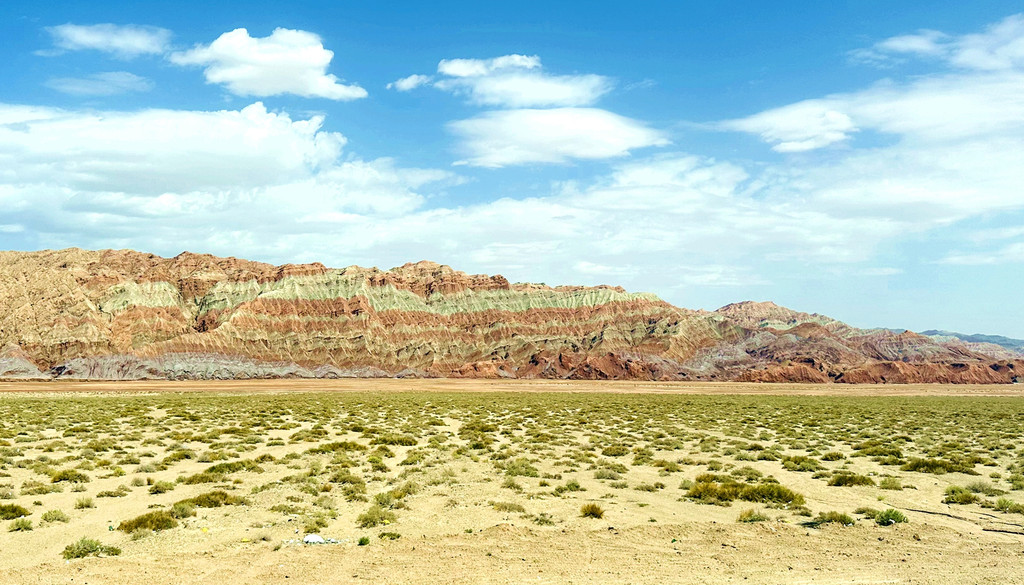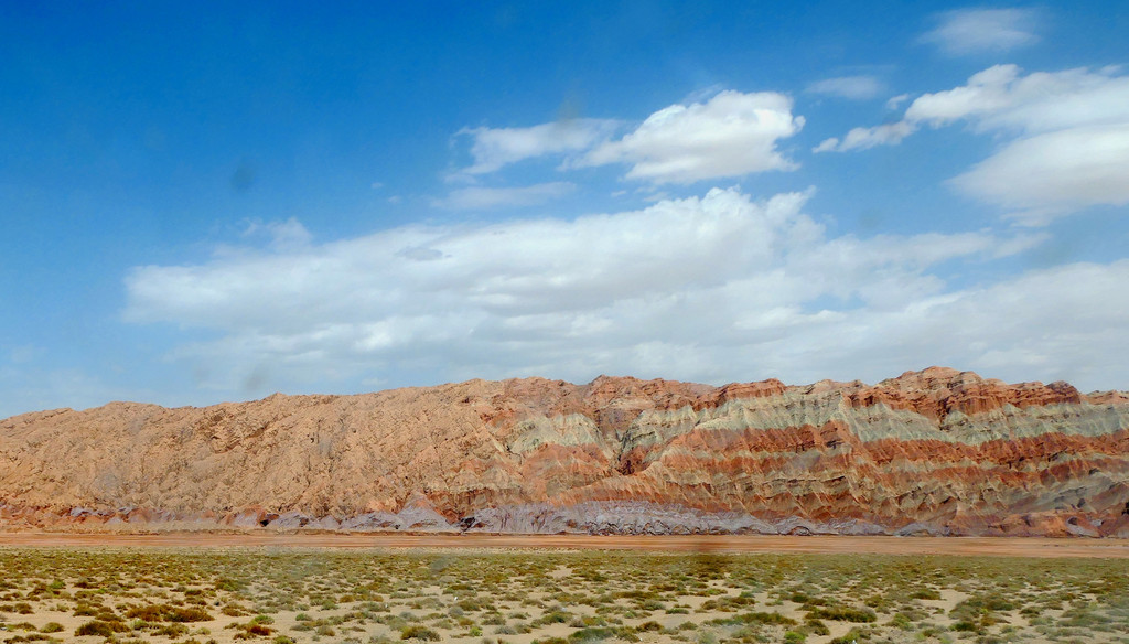 峡谷内的地面其实就是洪水过后的裸露河床,全为松软泥沙、石块,交通车只能沿着旧时的车辙,颠簸前行,稍离车辙便会撞上大小石块。12:45,我们搭乘交通车进入景区,最初的峡谷(主谷)非常开阔,两侧奇峰耸立,岩壁呈现十分明显的弯曲线条和挤压褶皱,它们都是远古地壳运动留下的印记。岩层的色彩更是一绝,红、黄、白、绿相互交织,堪称景自天成的彩绘画廊。