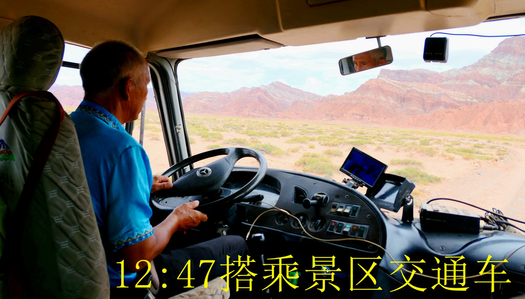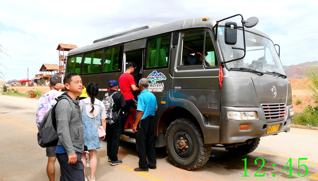 12:26抵达天山托木尔景区大峡谷游客中心,进入景区游玩可选自驾,或是搭乘景区交通车。然而,自驾必须是四轮驱动,我们的座驾虽为SUV,但却并非四驱,只得购票搭乘景区交通车,它是一种底盘特别高的特制中巴。