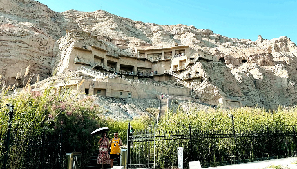 克孜尔千佛洞是我国古代西域龟兹国佛教艺术的典型代表,背倚明屋达格山,南临渭干河。虽然石窟内部禁止拍照,但站在窟室外面留影还是被允许的。从石窟群的高处俯瞰,景区的风景也是绝佳。