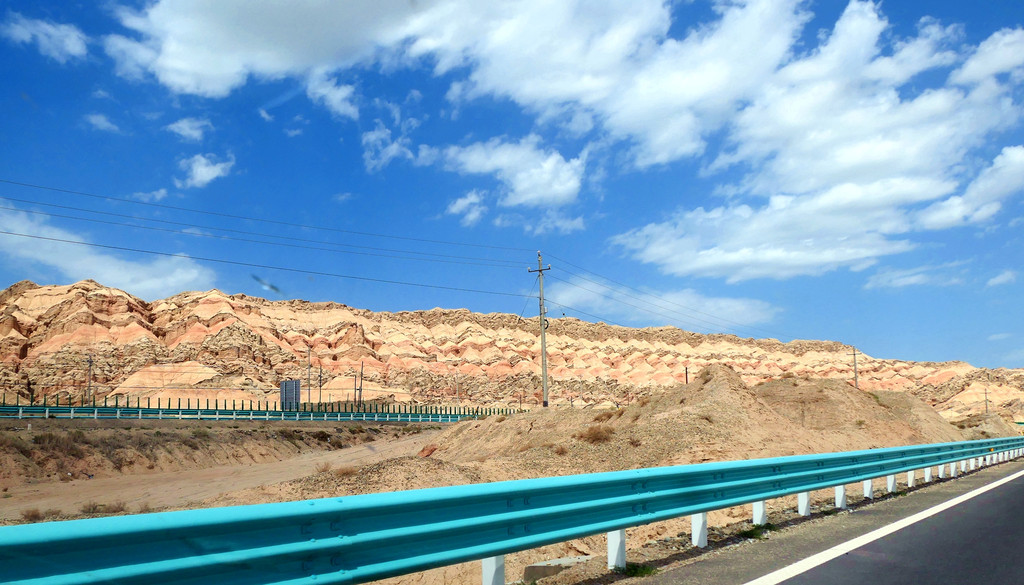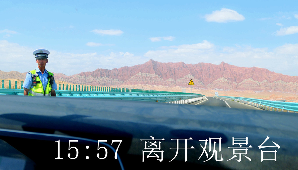 15:55驶入省道S307附设的一座大观景台(停车场),站在观景台上可以遥观对面彩色丹霞,长长的一道山峦,非常壮观,也非常漂亮。逗留5分钟后继续前行,道路右拐、过桥,壮丽的丹霞山梁转移至公路左侧,一直伴随我们前行,不离不弃长达半小时左右。