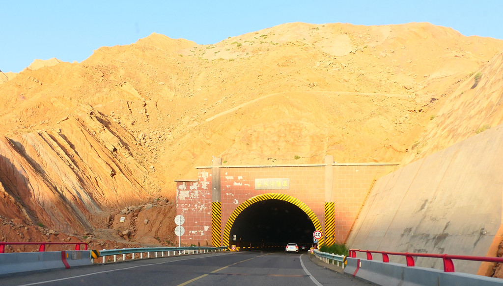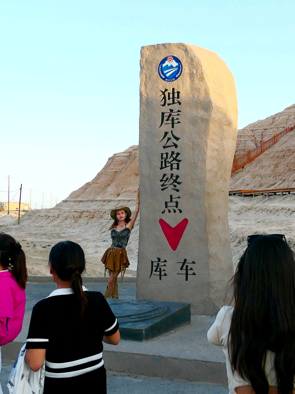 在丁字路口右拐向南,进入独库公路,继续驶往库车方向。20:49通过盐水沟隧道,20:56通过独库公路上的盐水沟收费站,21:04在路边的“雅丹地貌”观景点稍停。此处有座“独库公路终点”石碑,很多游人都在此处打卡,但因排队太长,我俩没有过去掺和。