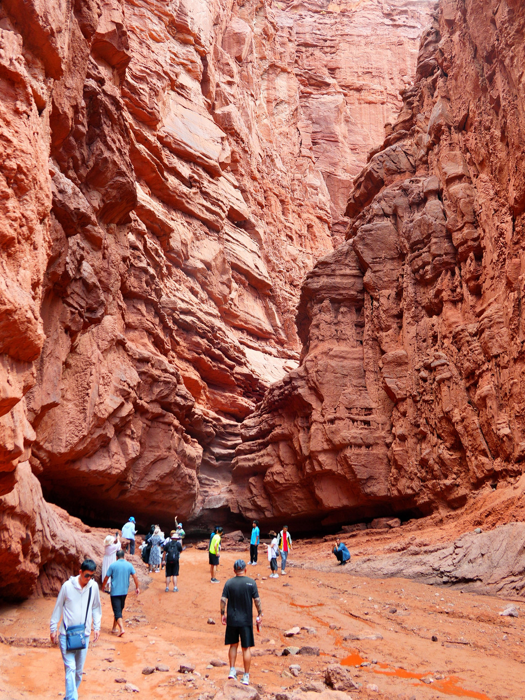 13:26,我们进入1号支谷,谷内地面也是季节性的洪水的通道,由于刚刚下过雨,景区工作人员不断提醒,如发洪水要尽快撤离。峡谷入口还算是比较宽阔,但越往里就越窄,两侧山体逐渐靠拢,最终是展现出崖壁高耸,头顶一线蓝天的险峻峡谷景观。