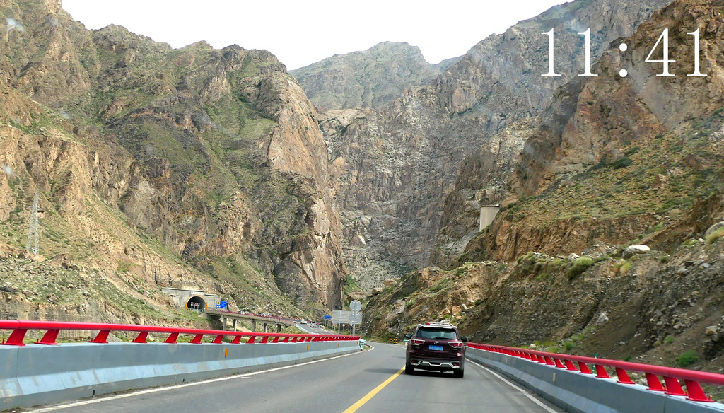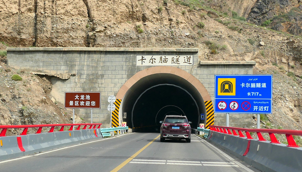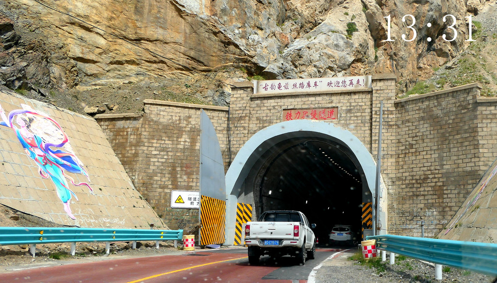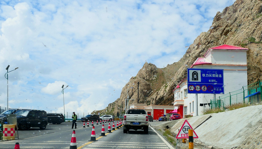 13:31,车辆抵达位于山顶的“铁力买提隧道”。隧道入口处设有一座规模不大的观景停车场,只可惜目前处于封闭状态,路障与交警指挥让我们直接进入隧道。交管部门也是不得已而为之,这么多的汽车,若都要争抢进入停车场观景,必定会在隧道入口引发交通拥堵。