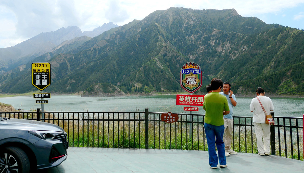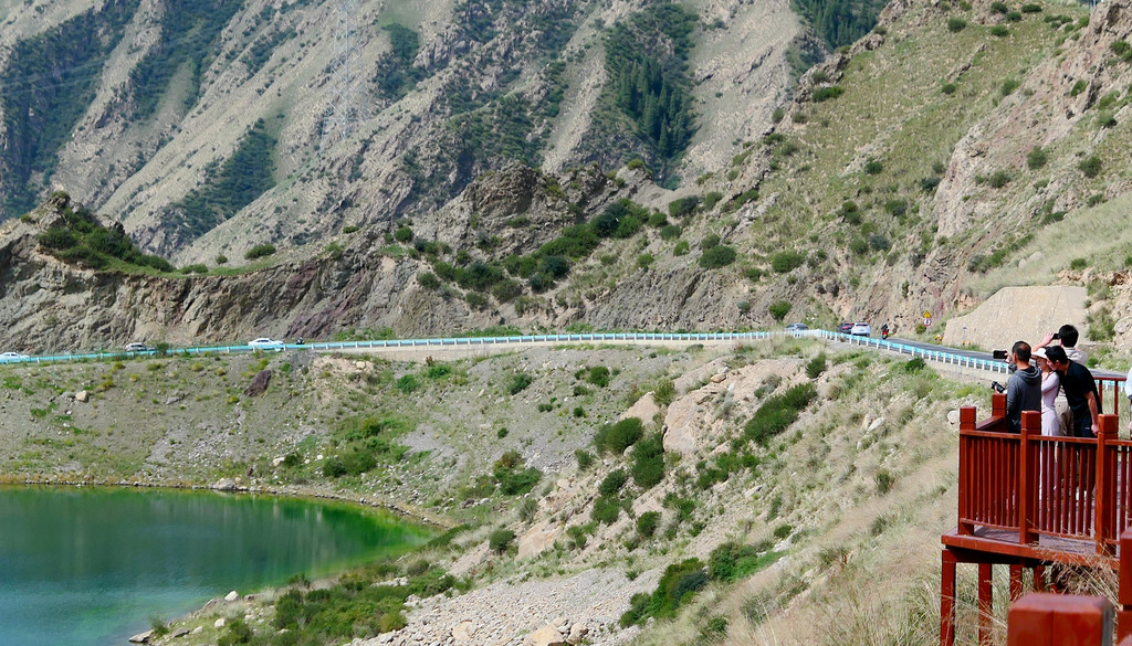 12:19,我们首先是驶抵小龙池,它紧靠路边,属免费景点,湖畔建有观景平台。然而,停车场距离湖水甚远,国道路边修建了长长栈道,将停车场与观景台相连,方便游人安全来往。眼前所见是一汪清澈碧绿的湖水,周围绿草、云杉,再衬托远处的云雾高山,感觉好似童话世界。