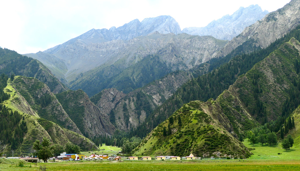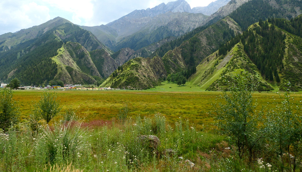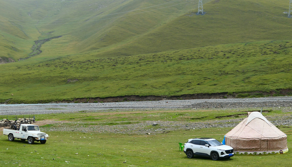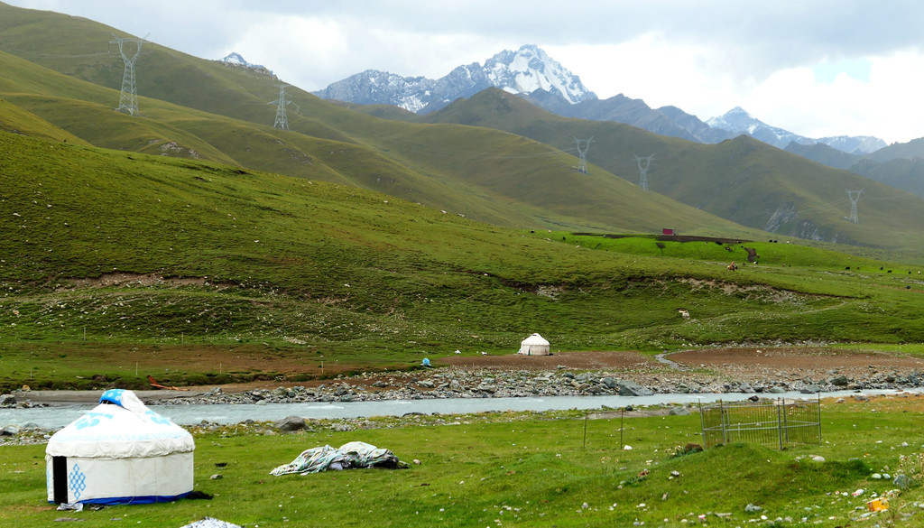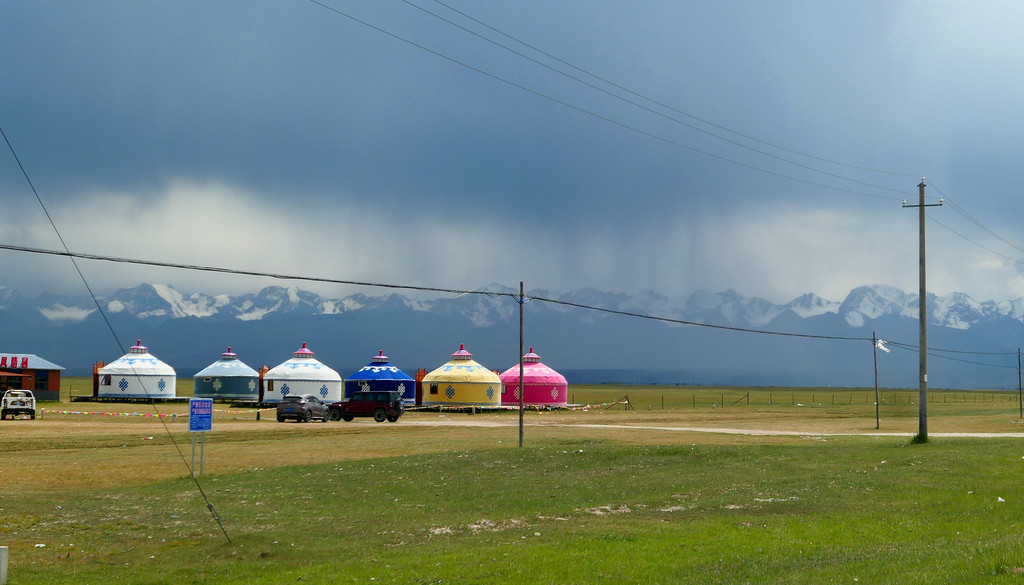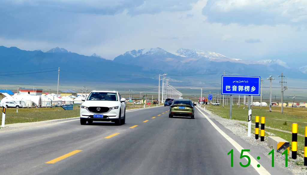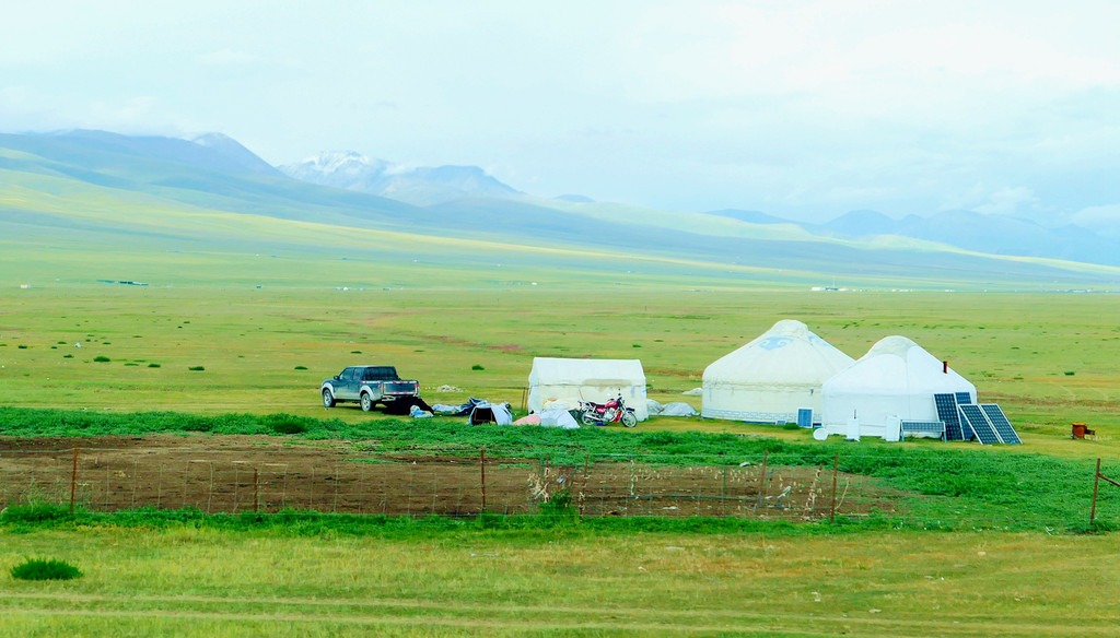 15:11驶经巴音郭勒乡,它隶属巴州和静县,居民主要为蒙古族,地广人稀,每平方公里不足1人。此地原为典型牧区,现今则是大力发展旅游,路边可见很多漂亮的蒙古包民宿。而且,与我们不久前一路过来所见到的草场不同,这儿的草原平坦无垠,辽阔得让我吃惊,放眼一马平川,唯有远处仍见雪山连绵。