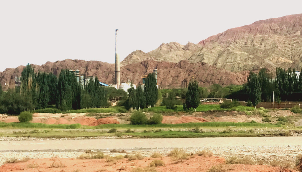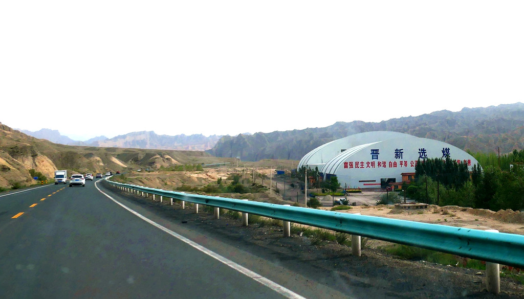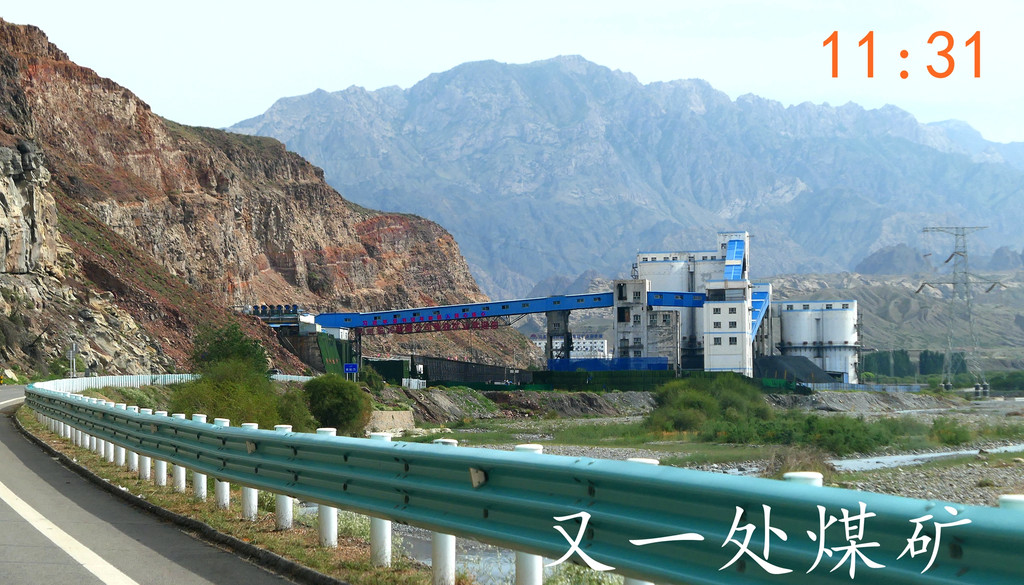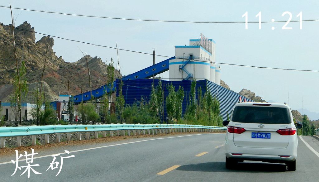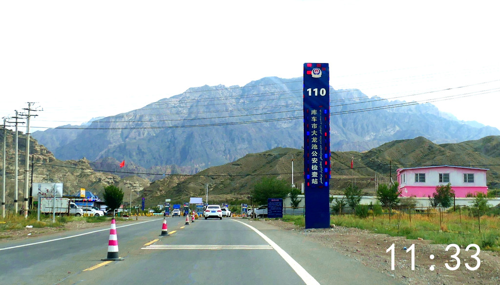 11:12驶经一处煤矿焦化厂,路边停放很多拉煤的重卡,右侧山脚下就是焦化厂的厂区,有一根高大火炬正在熊熊燃烧。11:33驶经“库车市大龙池公安检查站”,天山支脉区域的平缓的路段到此结束,随后就要开始翻越高耸崎岖的天山主脉。