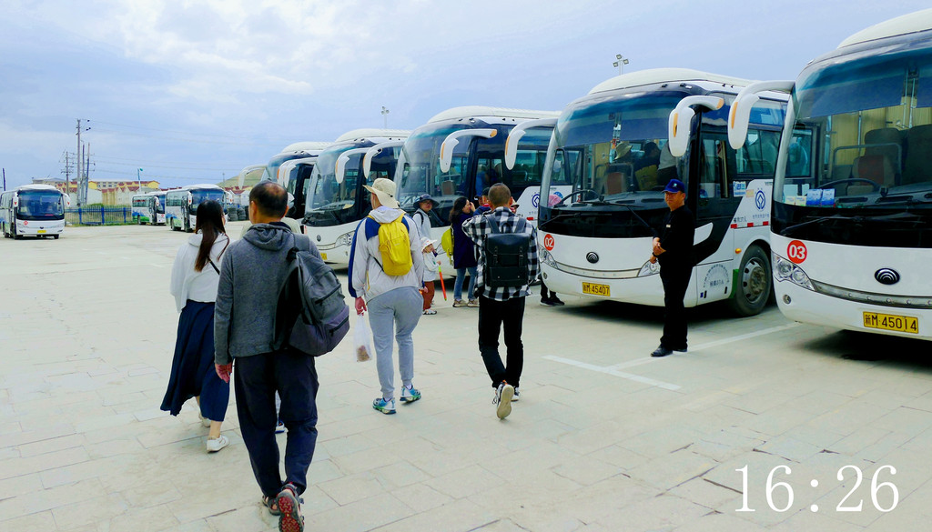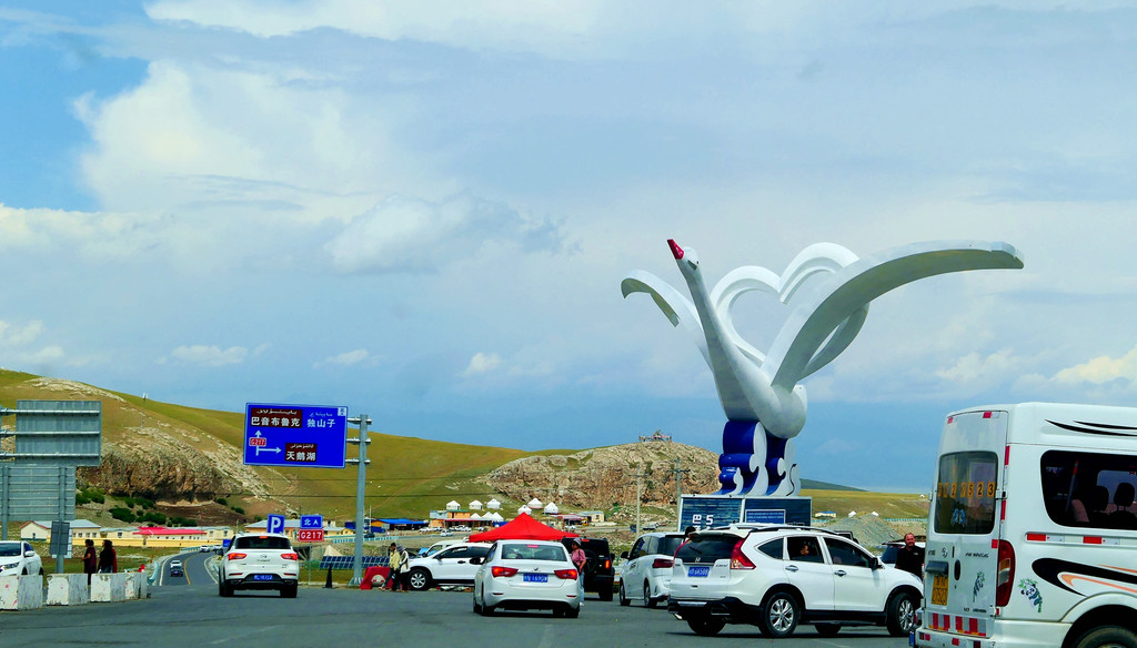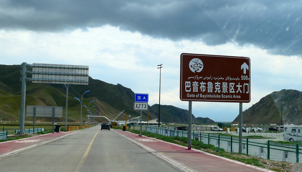 15:59驶经巴音布鲁克景区大门,这里有宽阔停车场,然而,一番询问后得知,外来车辆不准进入景区,游客只有购票搭乘景区交通车,方才能够进入景区游览。于是,我们继续往前,驶向景区游客中心。