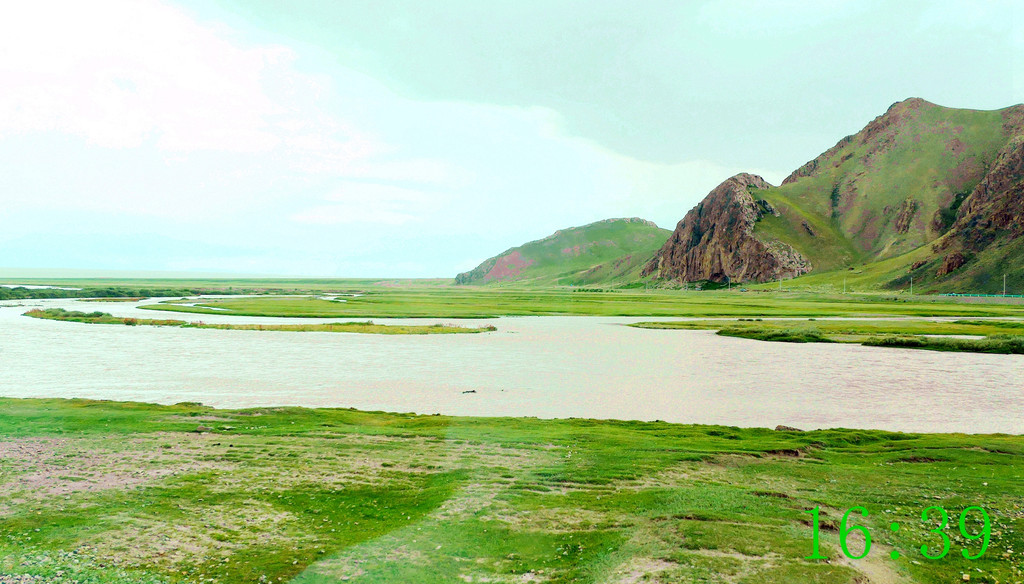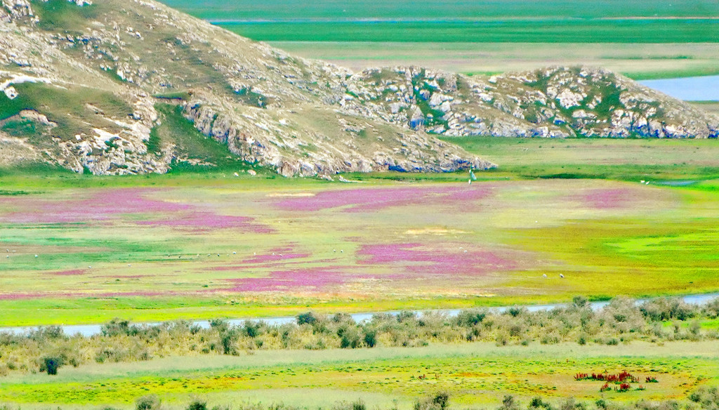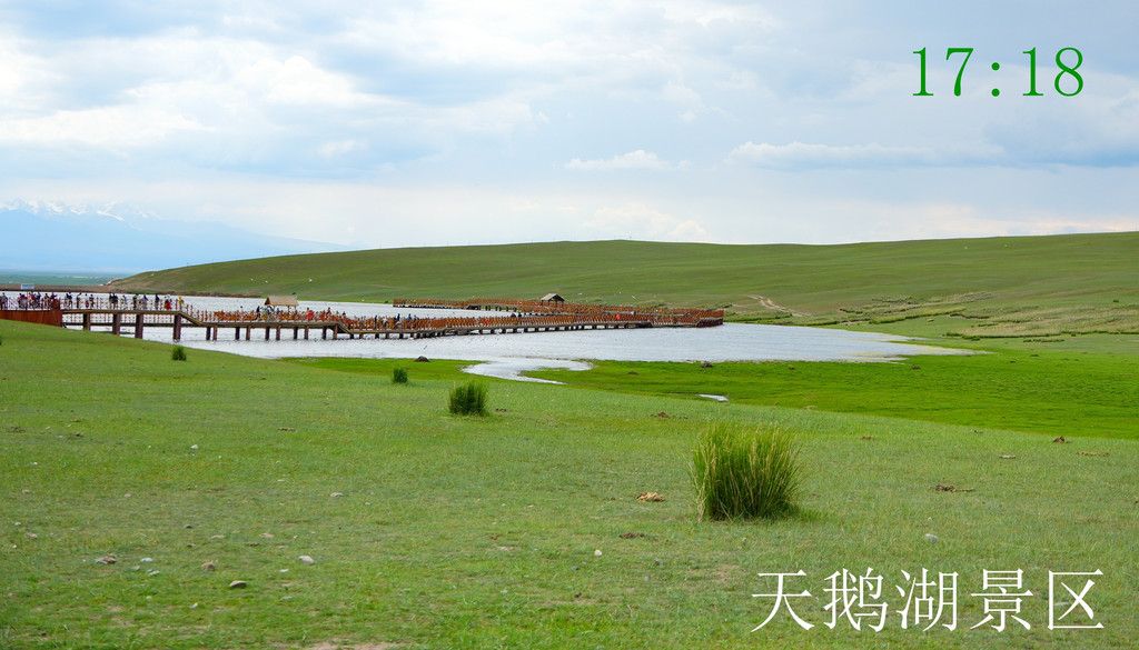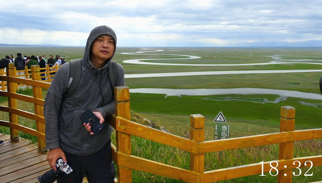 18:28登上观景台,美丽的巴音布鲁克草原刹那间便在我们脚下,毫无保留地铺展开来。若非亲临此境,实在是难以想象,在巍峨险峻的天山深处,竟然还能隐匿着这般浩瀚的草原。绿意葱茏的草原绵延至天边,与天际线上若隐若现的雪山相互映衬,此刻正是雨水丰沛季节,雨水浇灌后的草原墨绿青翠,不知名的紫红色野花也成片地开放,景色之美,令人心醉。