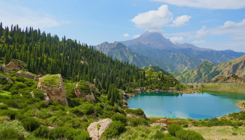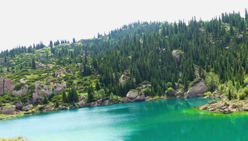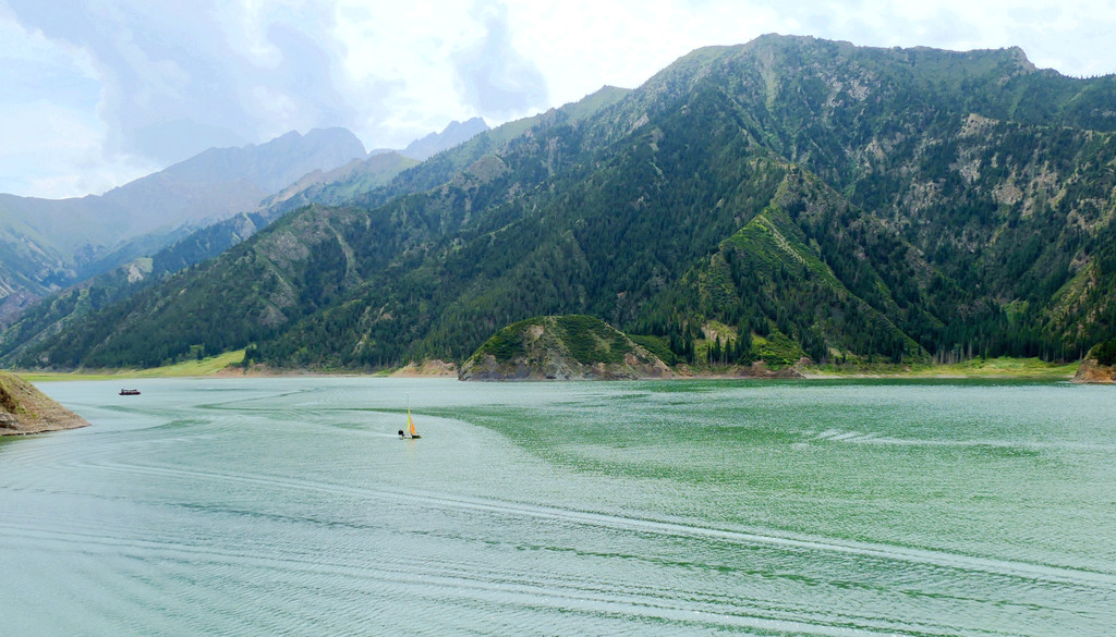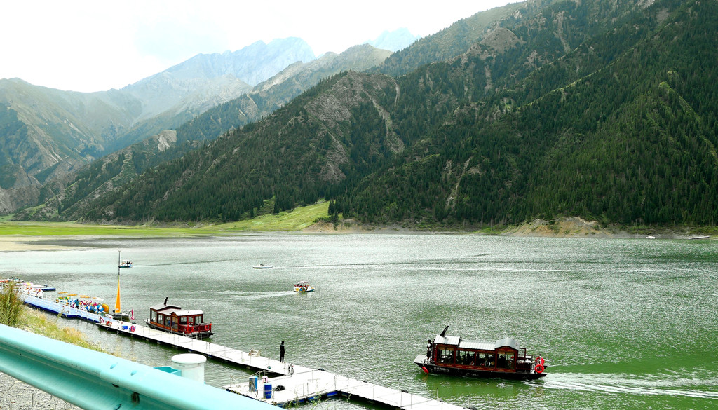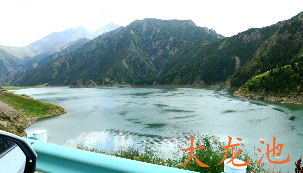 12:53又驶抵大龙池,观景台就在停车场边上,如果说小龙池仅仅是个景点,好比小家碧玉,大龙池则是应算大家闺秀,正经是个景区。大龙池的湖水跟小龙池一样碧绿,但面积要辽阔得多,湖水碧波荡漾,景区内也有付费帆船、游艇服务。周边山峦青翠欲滴,高大的云杉从山下一直蔓延到山顶,这和我们一路过来所看到的荒山秃岭形成鲜明对照。湖滩上还有大片的草场,远山脚下有排漂亮小房,据说都是当地的民宿。