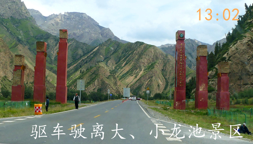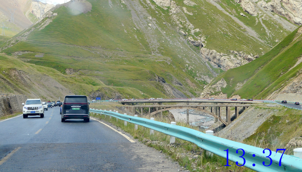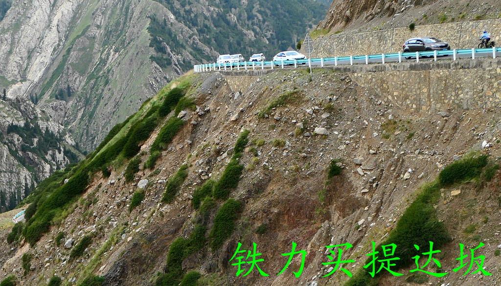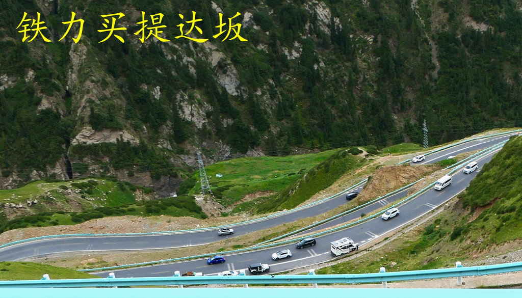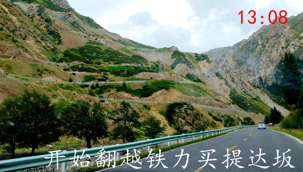 13:02驶离大小龙池景区,13:08开始翻越铁力买提达坂,“达坂”是蒙古语“山顶的隘口”或“山顶垭口”之意。盘山公路蜿蜒曲折,场面十分壮观,不过,由于路窄、坡陡、弯多,车辆往来频繁,而且沿途又无停车场与观景台,想要停车拍照,却是非常困难,也不安全。