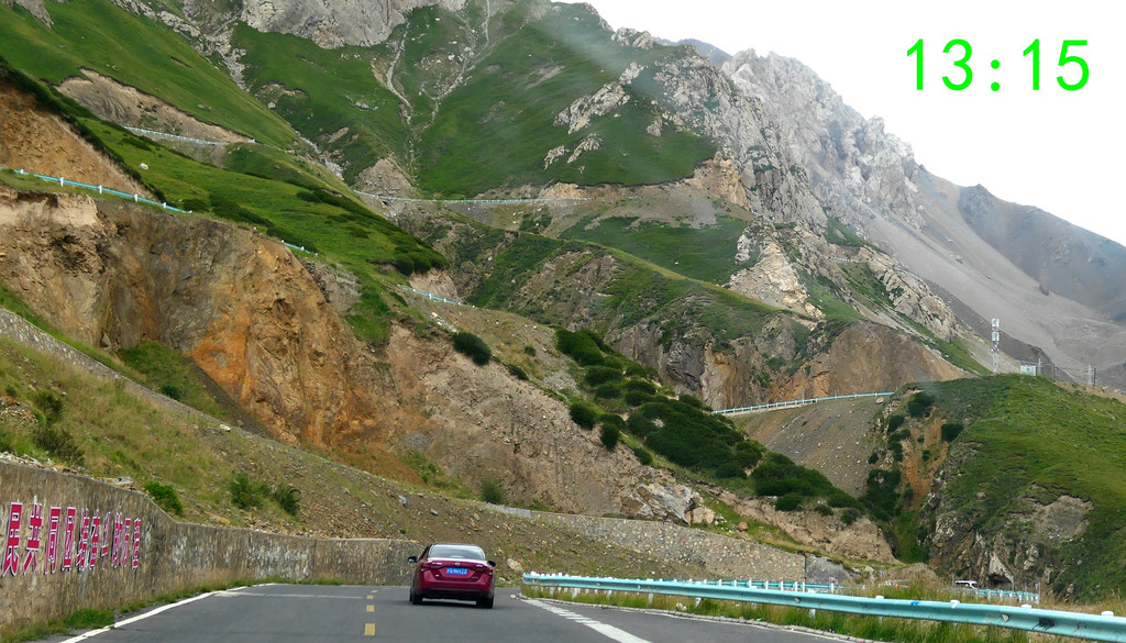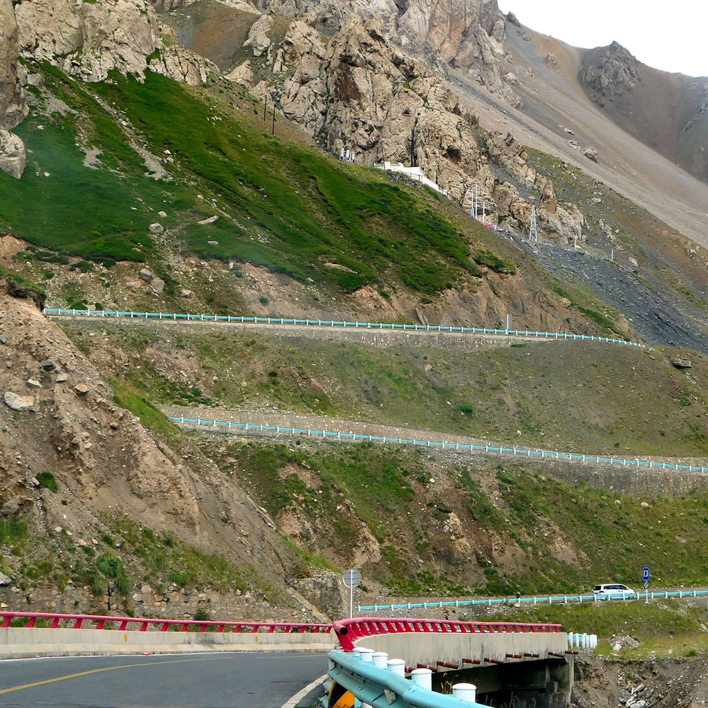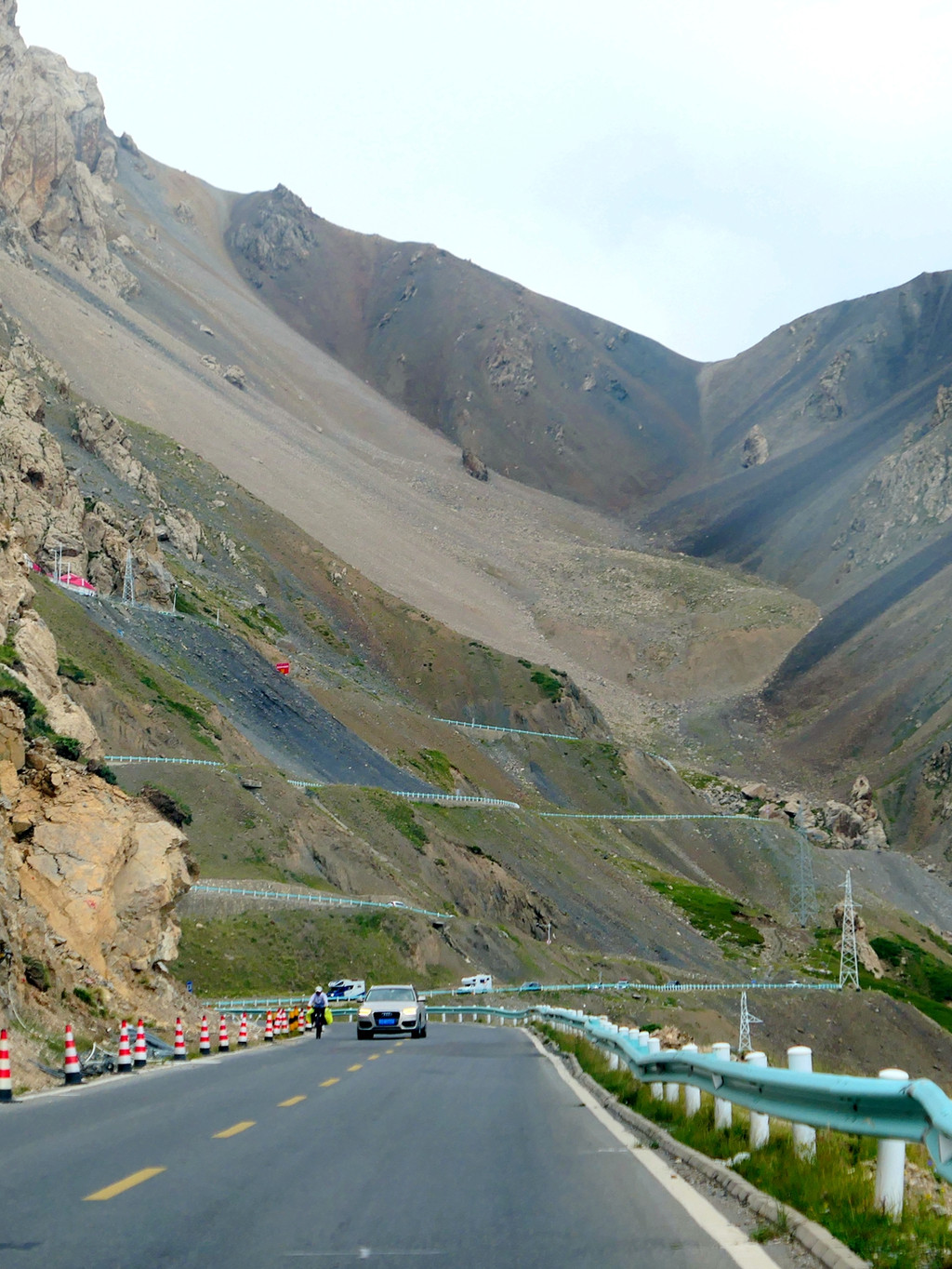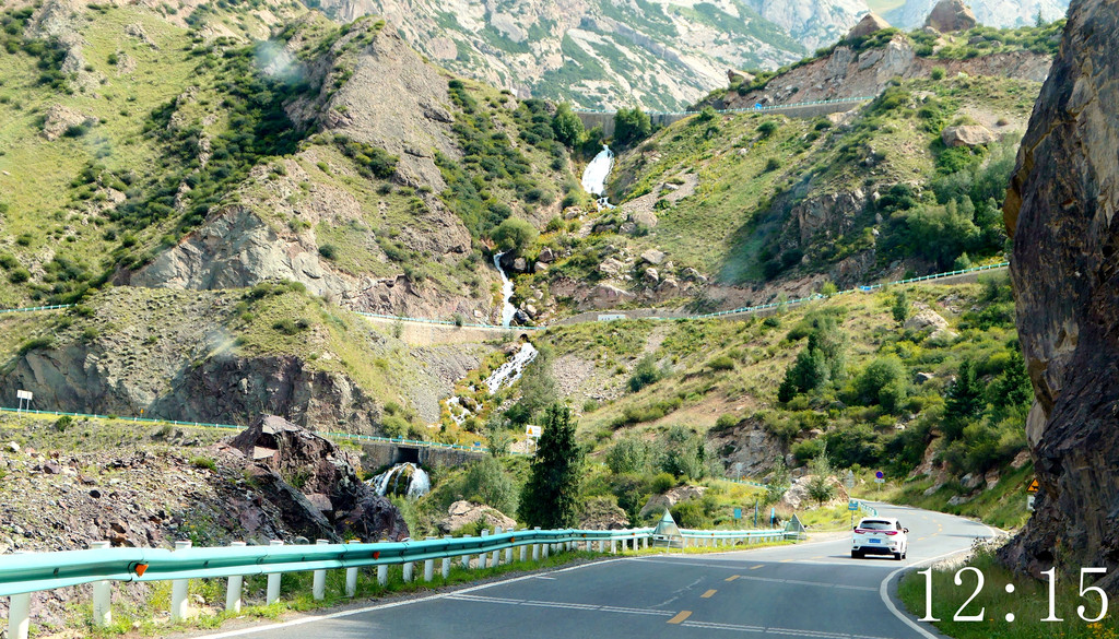 13:02驶离大小龙池景区,13:08开始翻越铁力买提达坂,“达坂”是蒙古语“山顶的隘口”或“山顶垭口”之意。盘山公路蜿蜒曲折,场面十分壮观,不过,由于路窄、坡陡、弯多,车辆往来频繁,而且沿途又无停车场与观景台,想要停车拍照,却是非常困难,也不安全。
