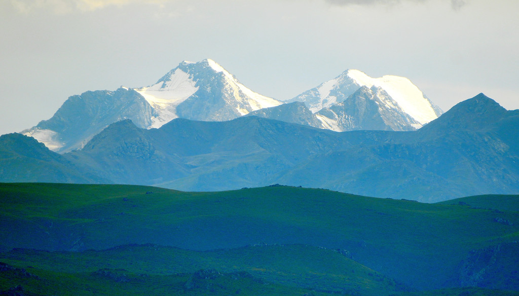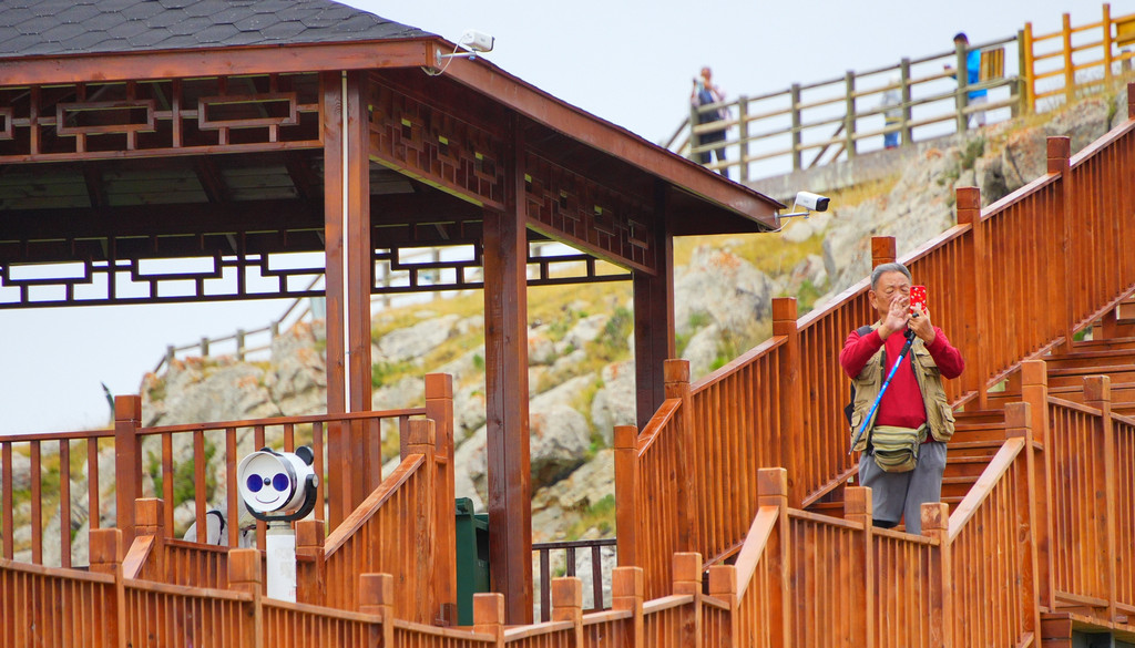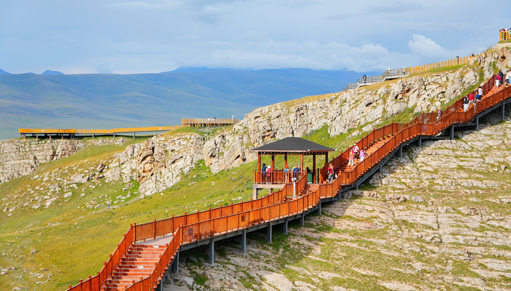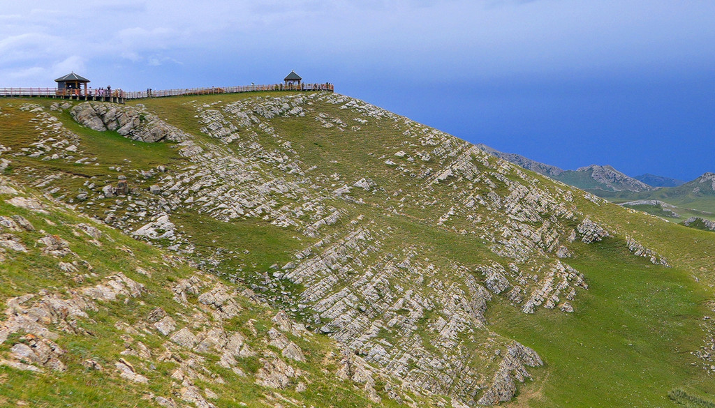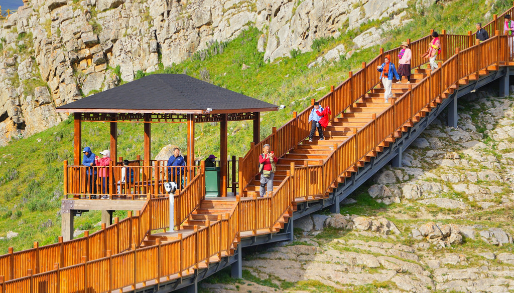 为了便于游客游览,景区在小山包上构筑了四通八达的观景栈道。X.J.手捧相机忙上忙下地拍照,我陪他攀爬一段阶梯后感觉有些疲惫,就只在一座小亭旁歇息、等他。巴西里克小山上到处都是裸露的山岩,然而,山岩的表面都很平滑,这让我猜想此处应该是曾有远古冰川活动。从观景台也可远眺我们刚去过的“巴润库热”寺庙,相距大约10公里。