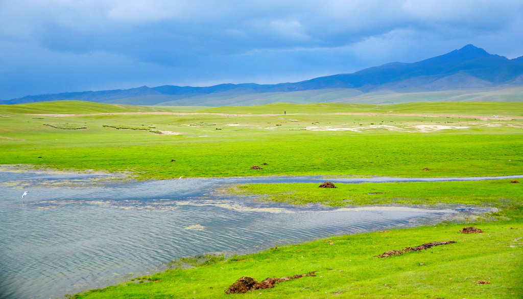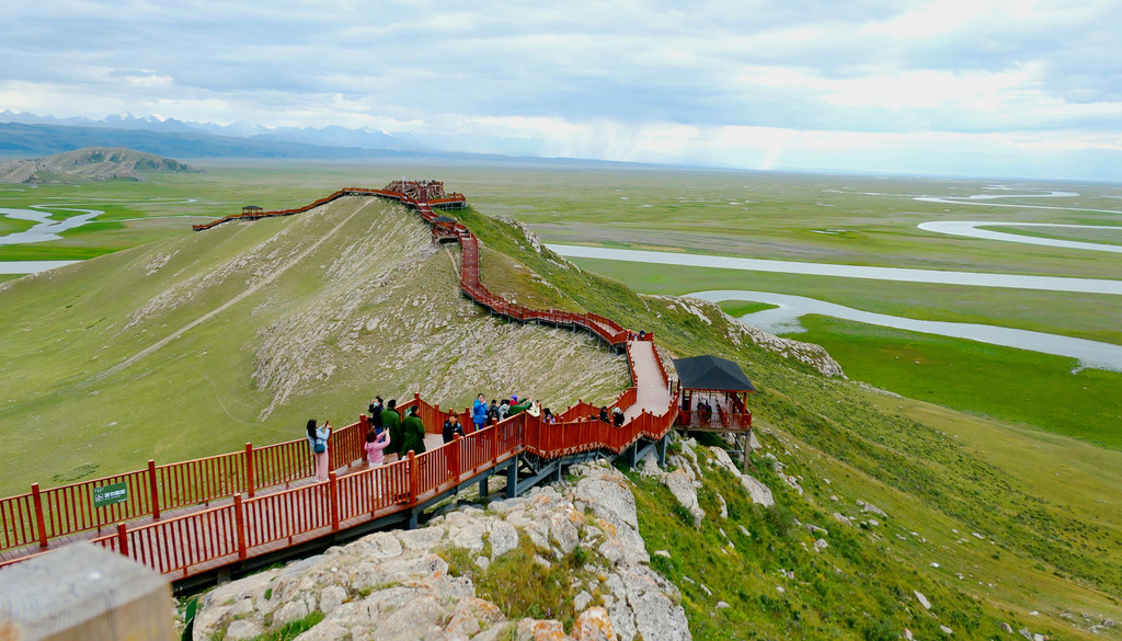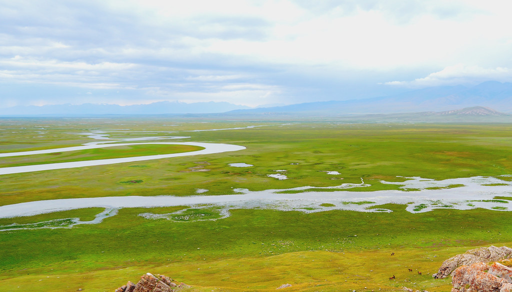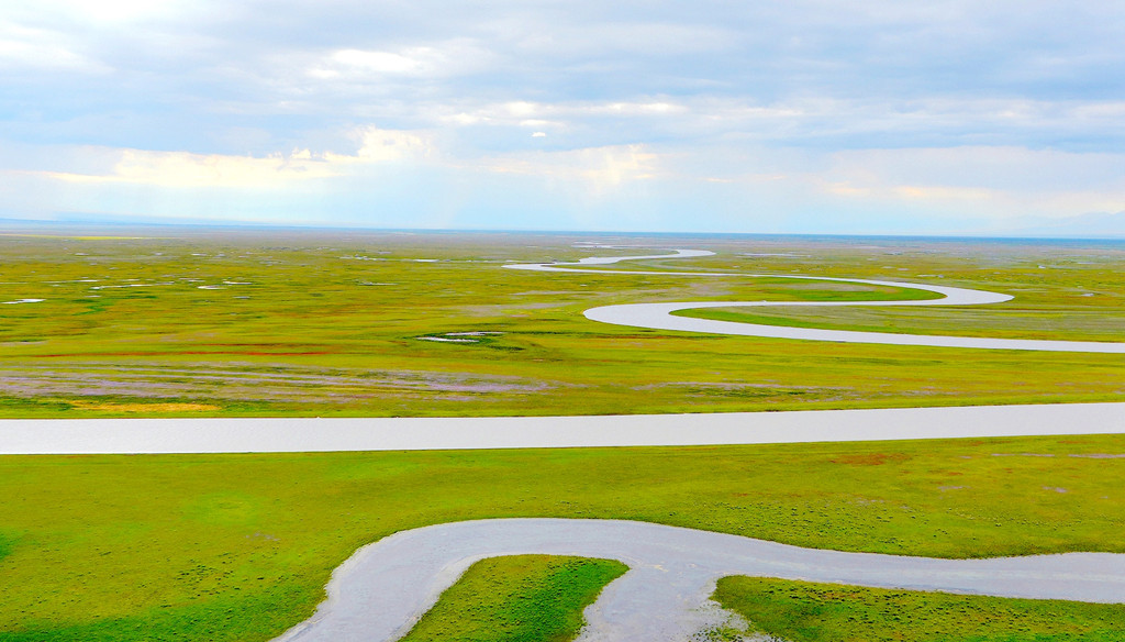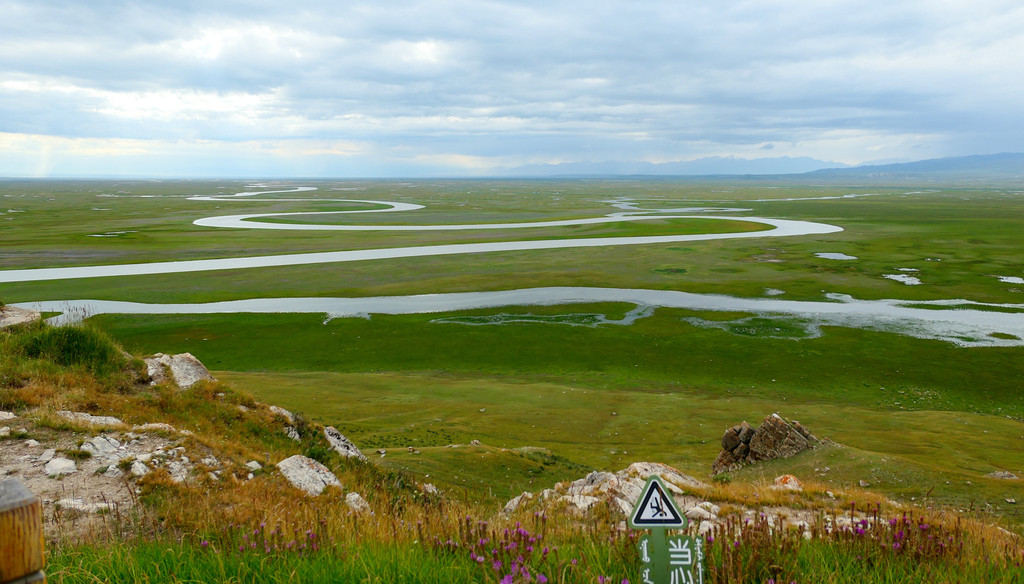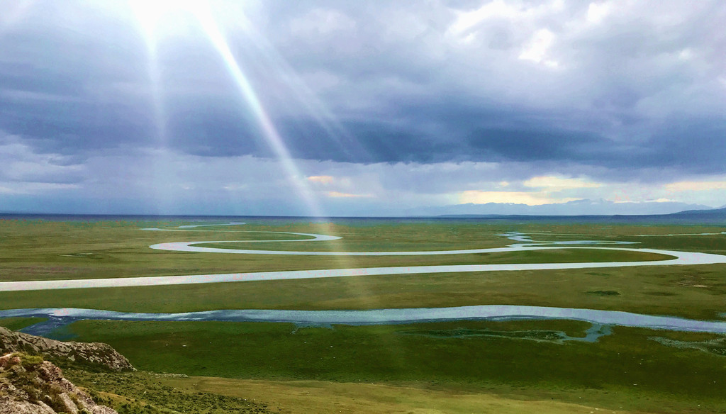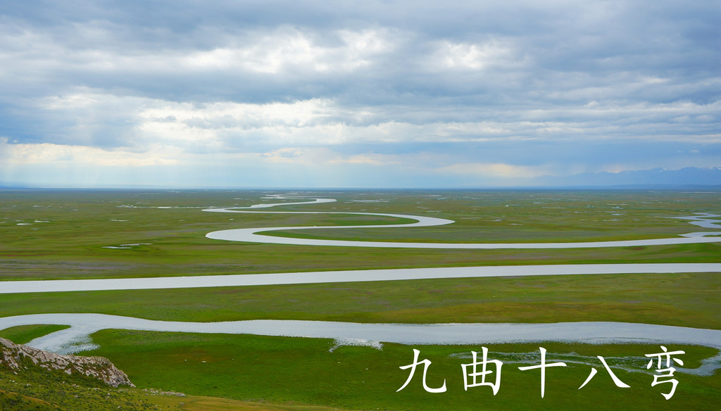 一望无际的草海与远山相接,开都河从西方天际缓缓地向我们走来,由于草原地势开阔平坦,致使河道犹如笔走龙蛇,蜿蜒曲折,所以,眼前的美景又有“九曲十八弯”之美称。据说,此处最美在于日落,可以在弯曲的河道上看到九个太阳倒映其中。然而,此刻的天空浓云密布,我们应该是无此福分。