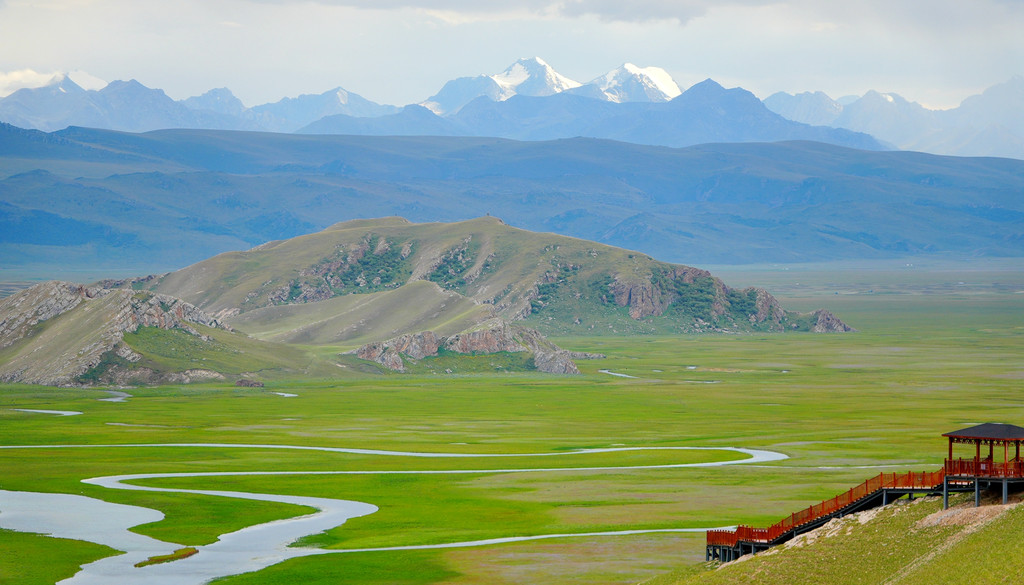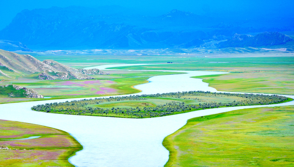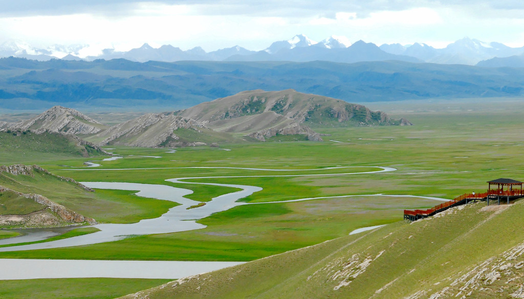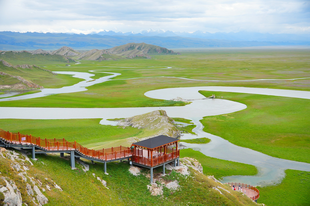 站在观景台上向西眺望,开都河就宛如一条飘舞的哈达,在草原上蜿蜒。它发源于观景台东面的北天山南坡,起初只是涓涓细流,一路向西,在巴音布鲁克草原收纳了依克如族海底克河与巴音郭勒河的水流。随后,河道急转 180°,掉头向东,又在观景台所处的巴西里克山脚下朝南,继而向东南方向奔流而去。开都河全长500多公里,天然落差1843米,流经和静、和硕、焉耆、博湖等县。沿途广纳众流,逐渐从一条小溪演变成为滔滔大河,最终注入博斯腾湖。
