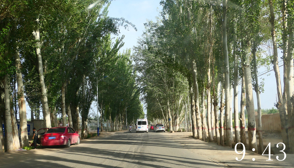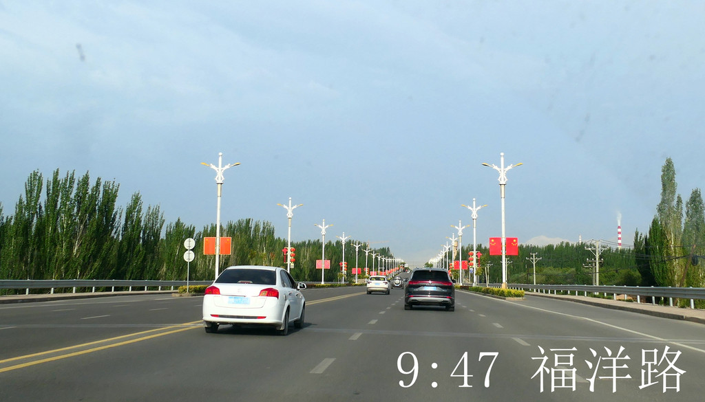 早8:30起床,窗外旭日东升,停放在路边汽车拖着长长的身影,此刻的天时应该只是相当于厦门6:30左右。 9:32出发,沿胜利路→福洋路再转G217独库公路,前往那拉提。