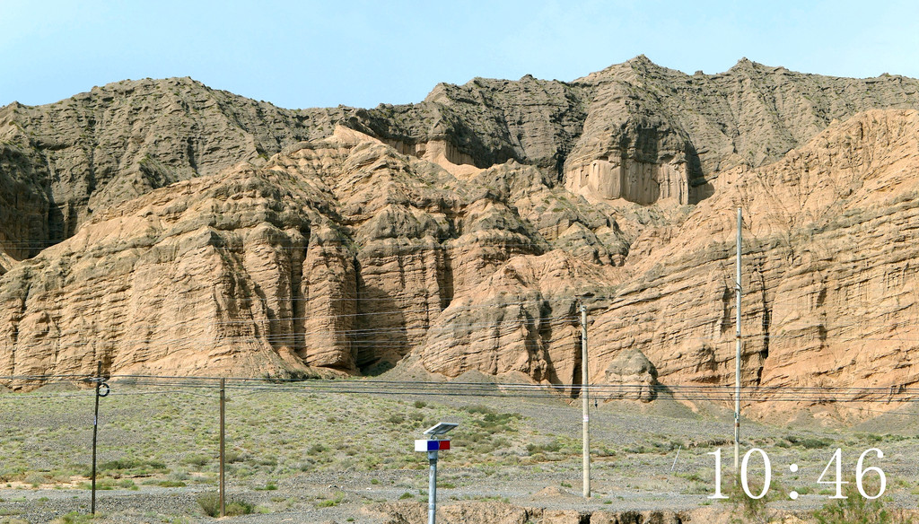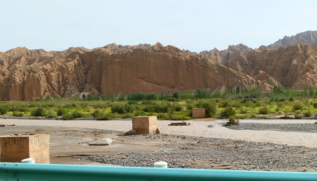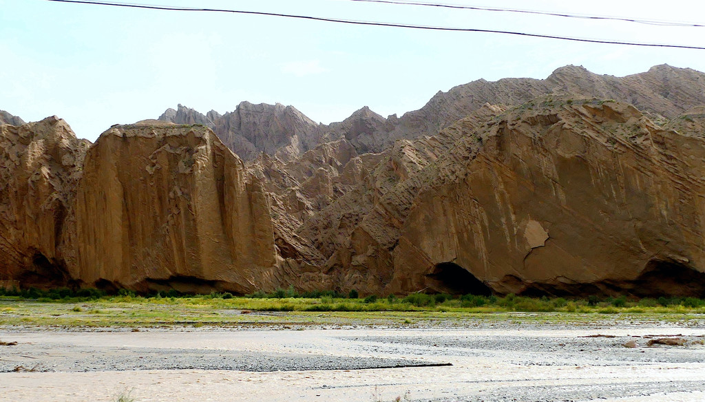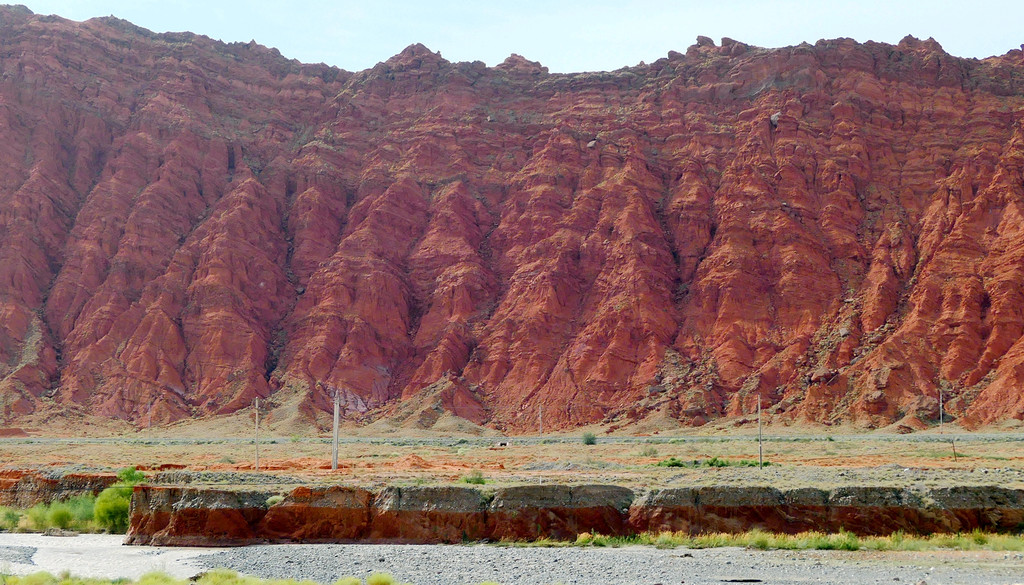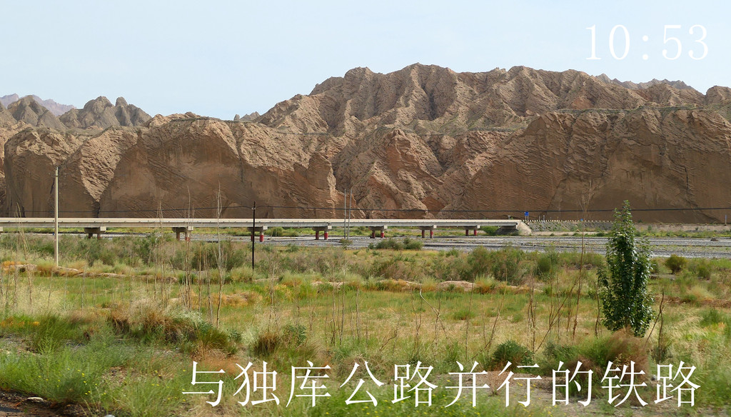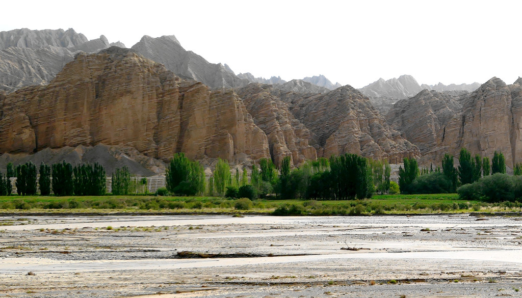库车琼萨依河在公路的右侧蜿蜒流淌,河对岸奇峰怪崖连绵不绝。这些山都不高,但却气势险峻,陡壁悬崖高耸,崖面平整状若刀削。据说,这一地带原本都是古代海洋,地质运动致使海床抬升,造就了眼前的山峦。陡崖面上,源自古海床的细密水平沉积条纹清晰可见,崖体的颜色也是多种多样,从褐色、黄色、浅红,到深灰、浅灰,层次分明。岩石裸露的山体寸草不生,这与山脚河滩上的盎然绿意形成强烈反差。有一条沿河铁路与独库公路大体并行,它终止与前方不远处的煤矿区域,猜想应是专为运煤所建。