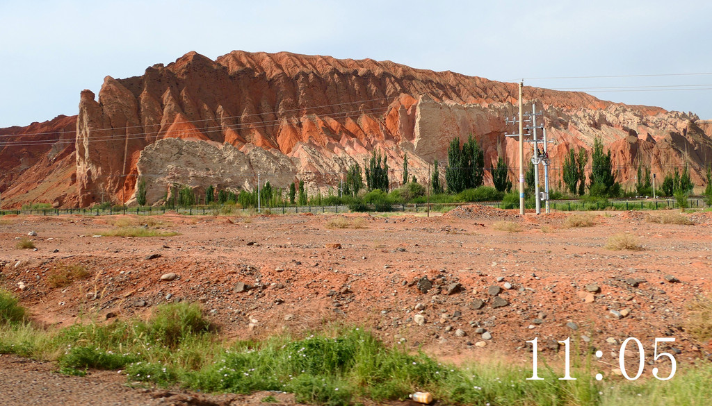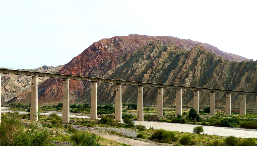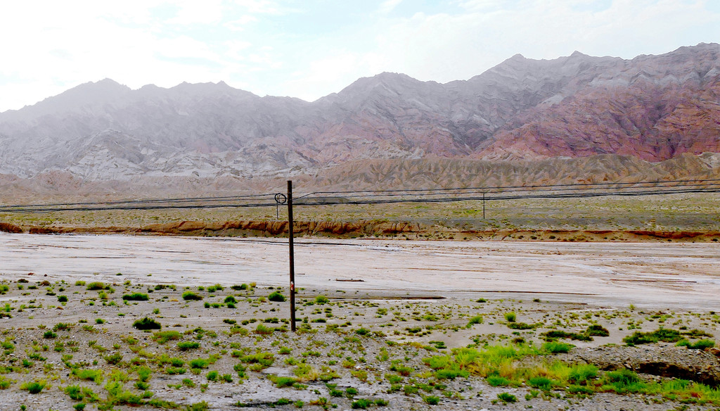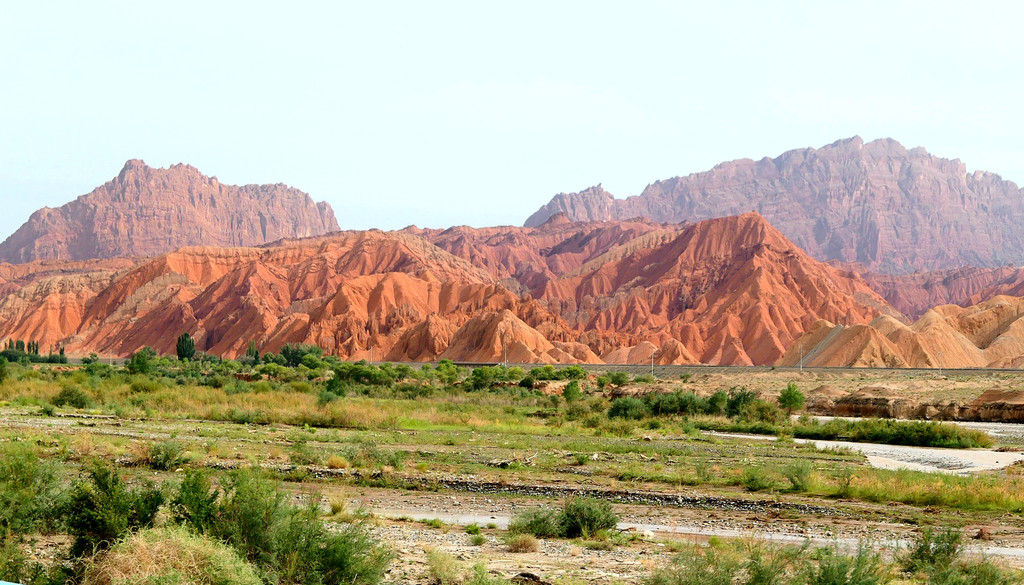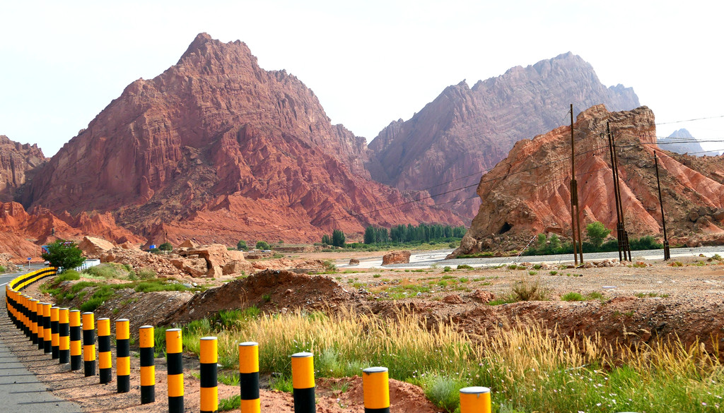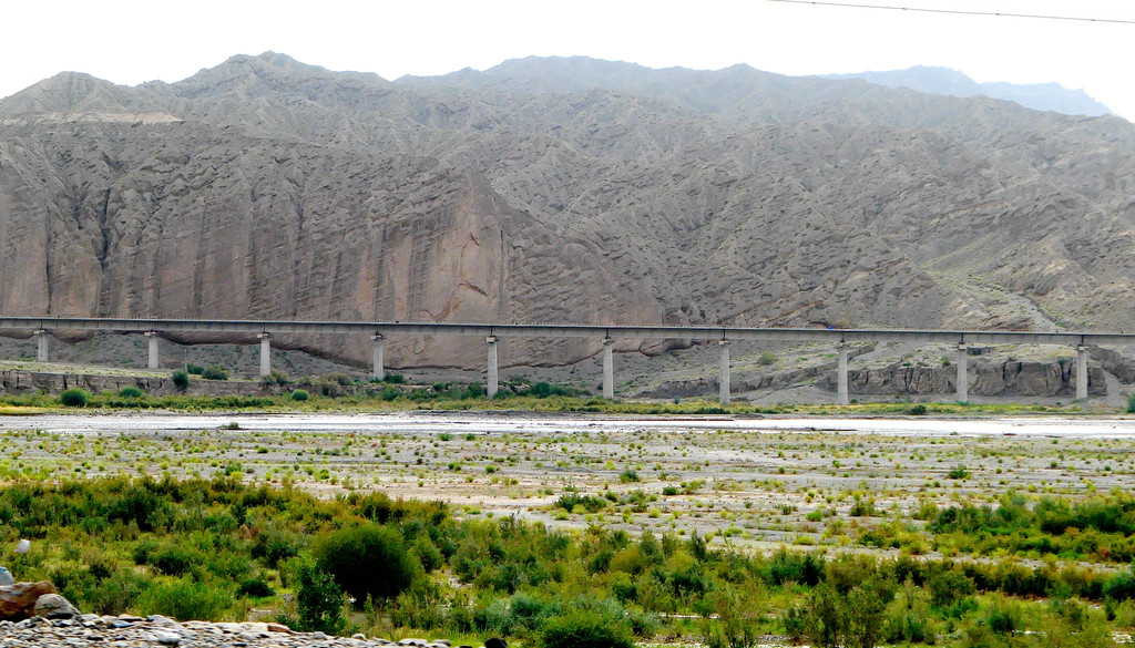 库车琼萨依河在公路的右侧蜿蜒流淌,河对岸奇峰怪崖连绵不绝。这些山都不高,但却气势险峻,陡壁悬崖高耸,崖面平整状若刀削。据说,这一地带原本都是古代海洋,地质运动致使海床抬升,造就了眼前的山峦。陡崖面上,源自古海床的细密水平沉积条纹清晰可见,崖体的颜色也是多种多样,从褐色、黄色、浅红,到深灰、浅灰,层次分明。岩石裸露的山体寸草不生,这与山脚河滩上的盎然绿意形成强烈反差。有一条沿河铁路与独库公路大体并行,它终止与前方不远处的煤矿区域,猜想应是专为运煤所建。