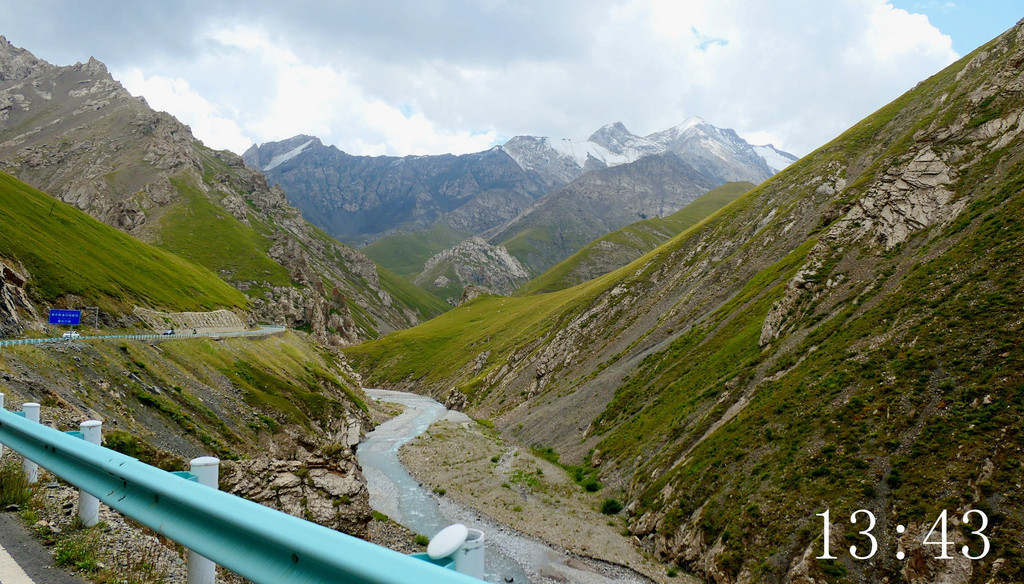 铁力买提隧道海拔3220米,长1894米,入口位于阿克苏地区库车市,出口则是巴州和静县,它是独库公路从库车前往独山子,所必须翻越天山四处达坂之第一座。13:31,我们从库车驶入隧道,大约7分钟后从和静县驶出。出隧道后的公路依旧是蜿蜒翻山,山势也依然巍峨陡峭,远处皑皑雪峰,近处葱郁青山,共同勾勒出一幅壮美动人的山水画卷。