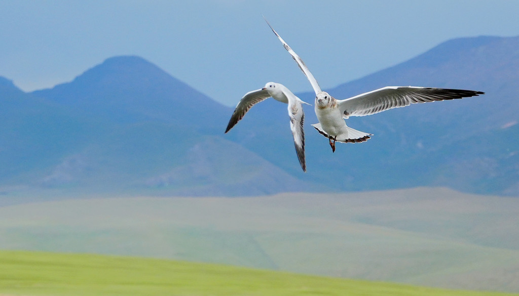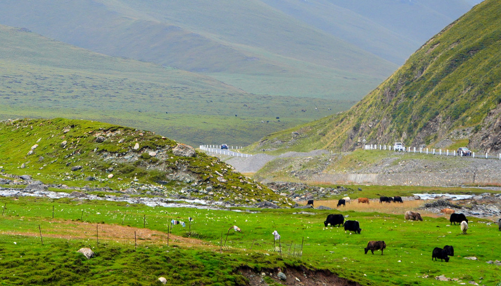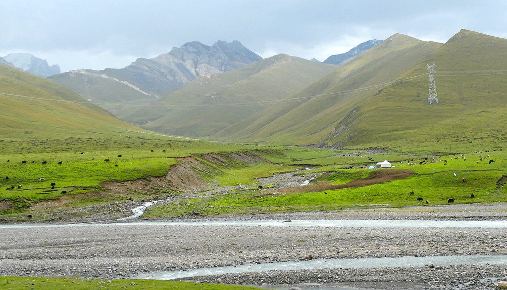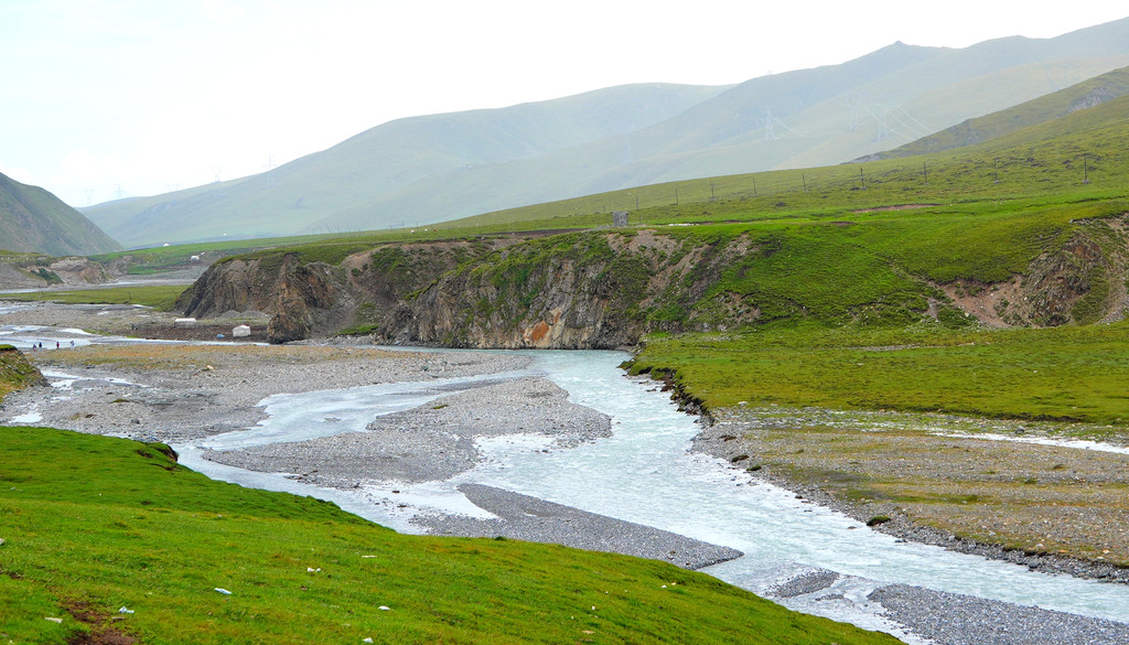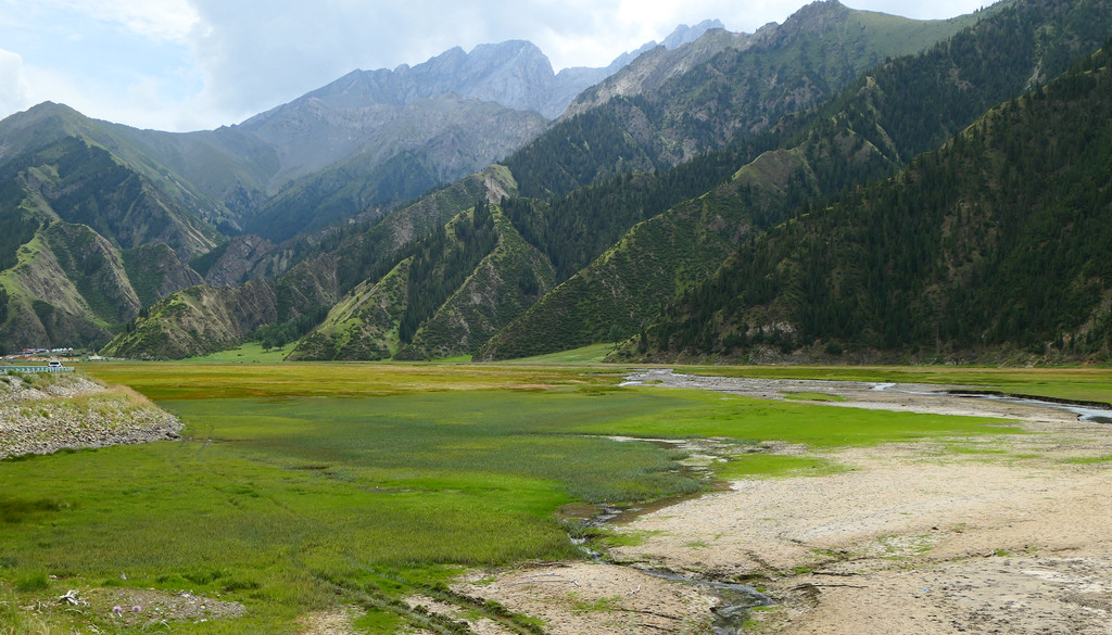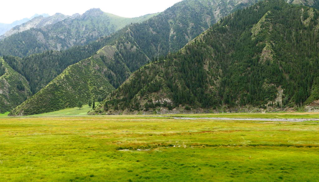 继续前行,我们驶入了巴音布鲁克草原,引入眼帘的景观也出现了如梦似幻的变化。崎岖险峰悄然隐退,取而代之是连绵不绝的漫坡丘陵。青山依旧,但却只有茸茸绿草,不见一棵大树。清澈、平静的巴音郭勒小河伴随公路流淌,它是开都河的支流,后者发源于天山山脉中段,流经巴音布鲁克草原,最终是注入我们此番来疆次日就曾拜访过的博斯腾湖。