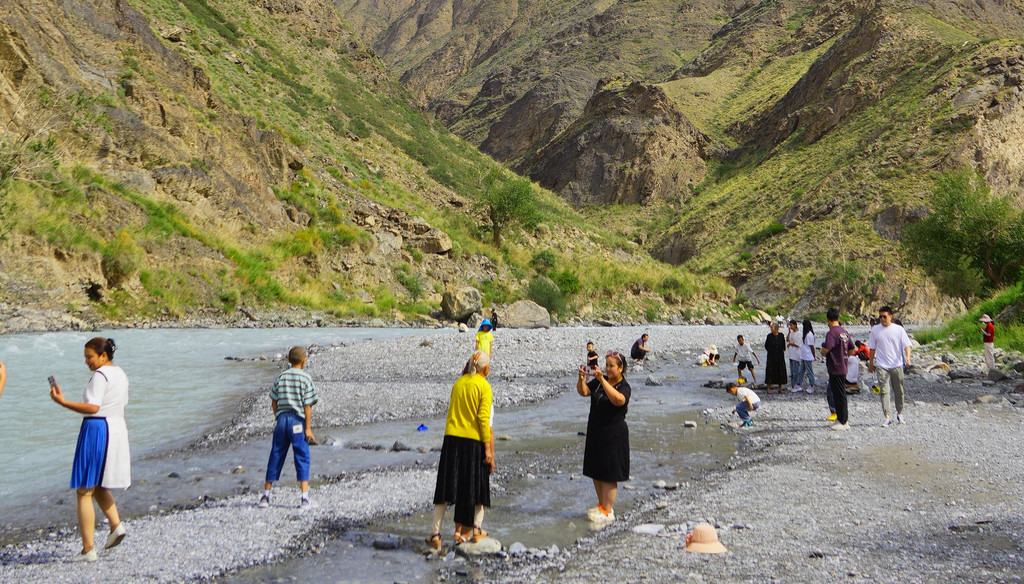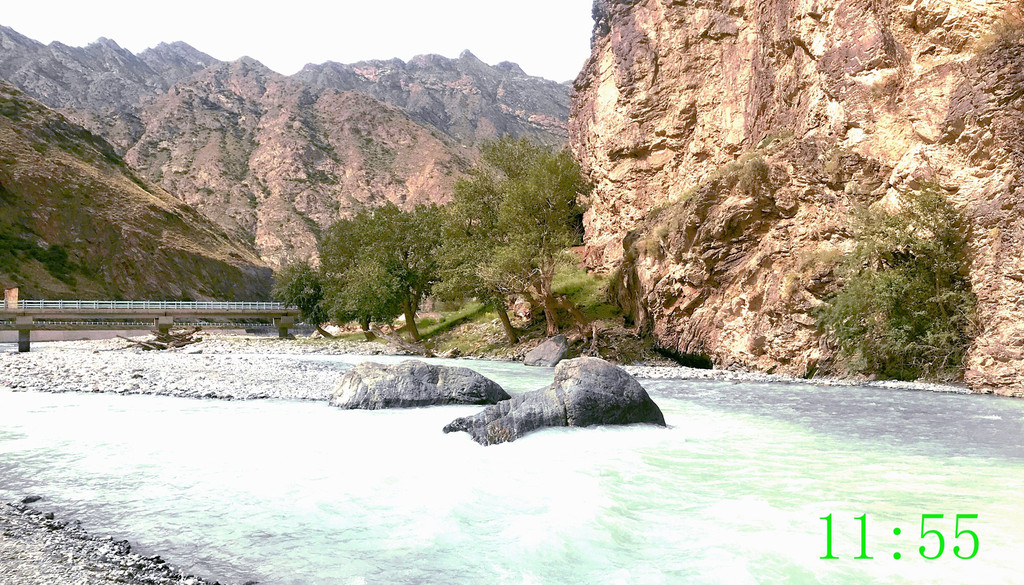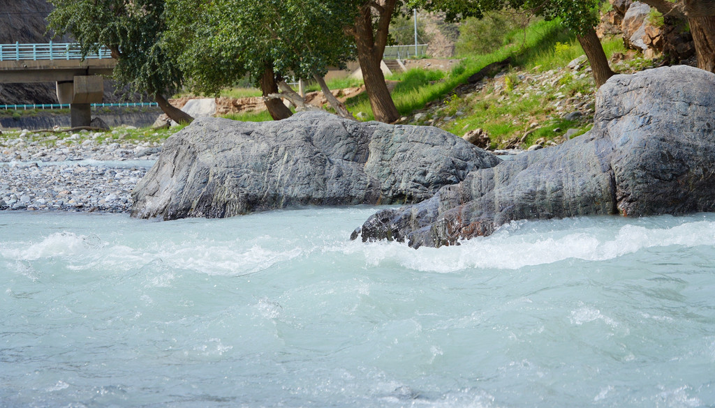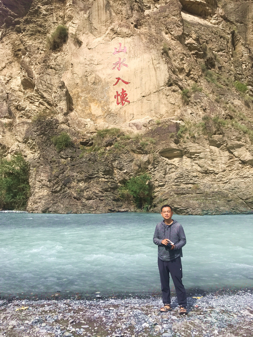 11:42穿越卡尔脑隧道,出隧道后行驶大约2公里,看到路边沿河有一小片树林,路人纷纷停车,我们跟随众人下车,穿越树林来到河边。清澈、湍急的卡尔脑河在这里形成一大片卵石浅滩,河对岸的陡崖上有红色大字“山水入懐”,其中“怀”为繁体,不知是哪个年代的题刻。