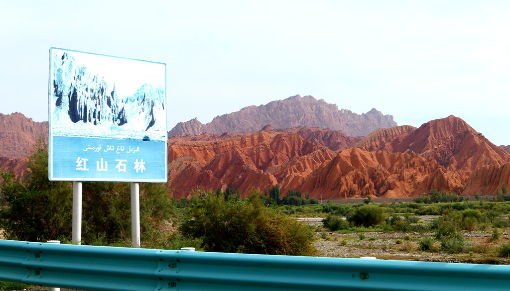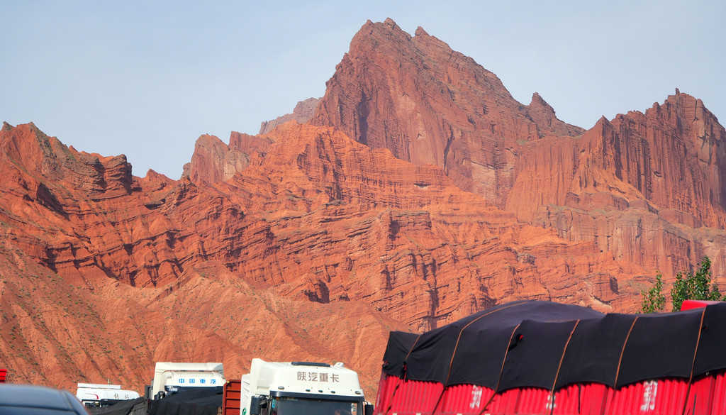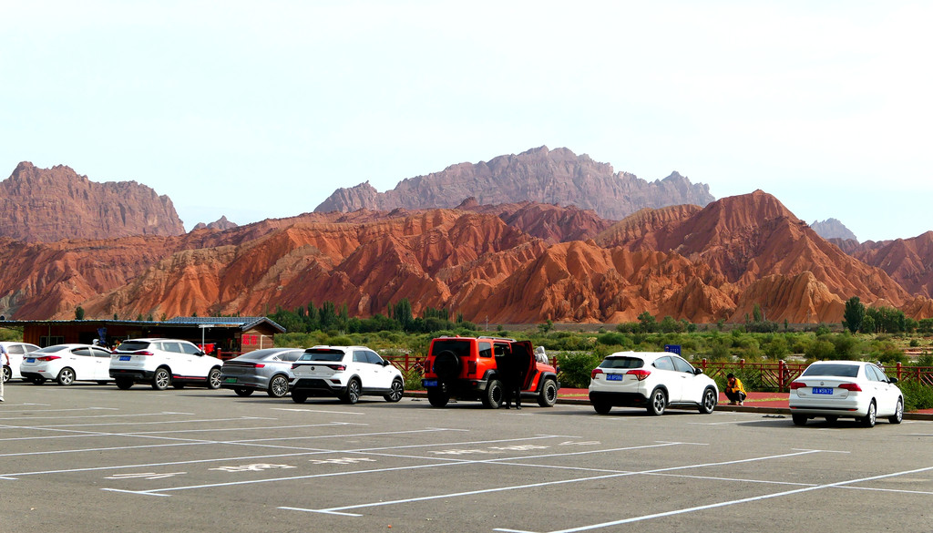 10:55看到“红山石林”地标牌,附近有停车区,我们驶入稍停。放眼四望,周边的山形、山势都跟过往没啥变化,依旧是山并不太高,山势峥嵘险峻。然而,映入眼帘的色彩却是发生了巨大的变化,山峦全都呈现出不同色调的红色,橘红、大红、深红、紫红,非常漂亮。