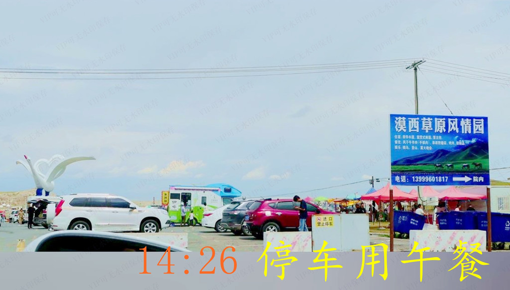 14:26路经“漠西草原风情园”,有座白天鹅雕塑很是惹眼。此处可以提供餐饮,也正好是到了饭点,我们停车吃午餐。在大草原上享用午餐也是别有一番情趣,我和X.J.各点了一份羊腿抓饭,X.J.还专为我额外买了两个羊肉烤串。