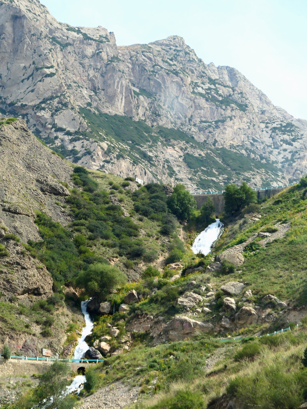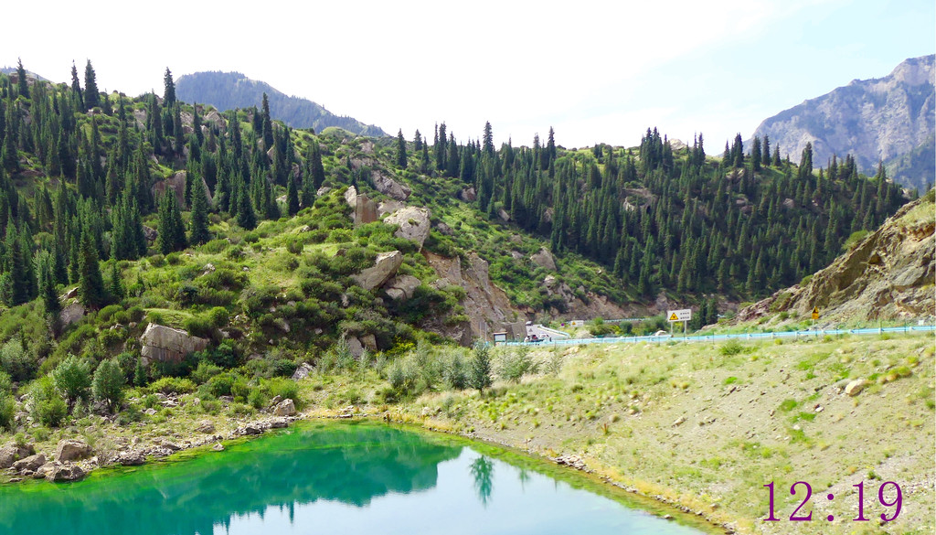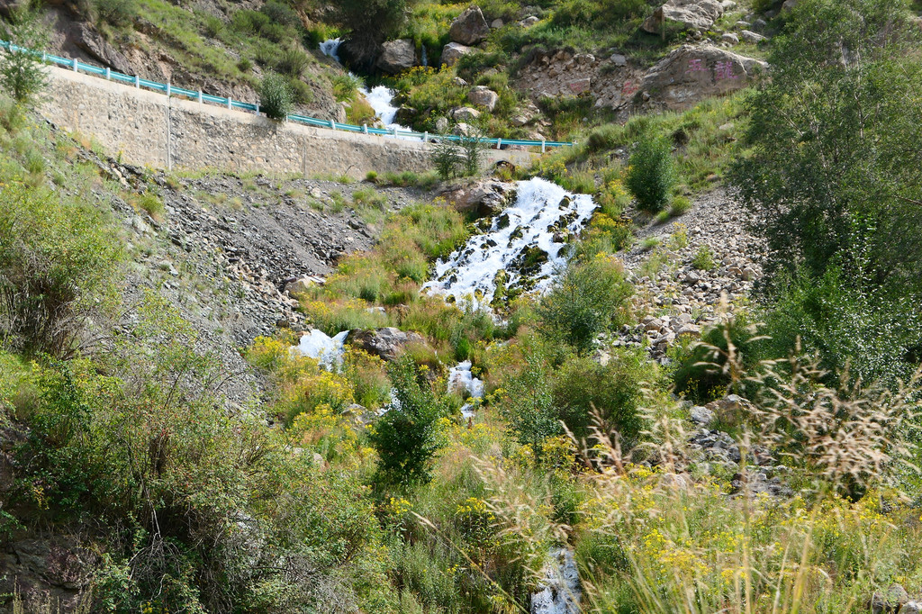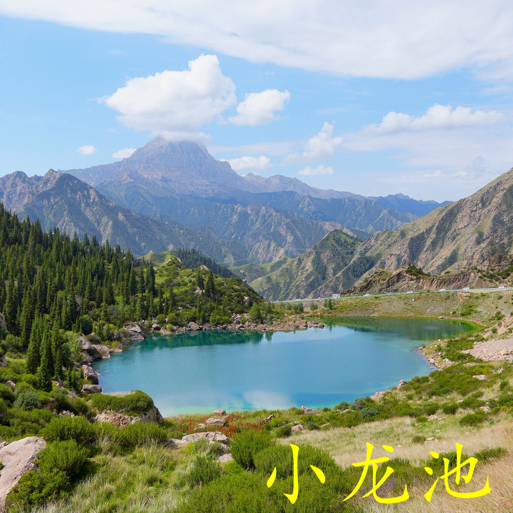 稍事逗留后继续前行,一路所见依旧是深邃的峡谷,过往汽车络绎不绝。12:15遇到盘山公路,有一条“龙池瀑布”从高处流下,瀑布顶端就是独库公路沿线著名的大小龙池景区。大、小龙池是位于天山海拔2400米处的两片清澈水面,两湖相距约2公里,水源来自周边雪山和当地山间降雨。大龙池面积约2平方公里,环湖有多处泉水汇入,小龙池面积仅0.025平方公里,大龙池水经岩层渗透,最终又成为小龙池的水源。