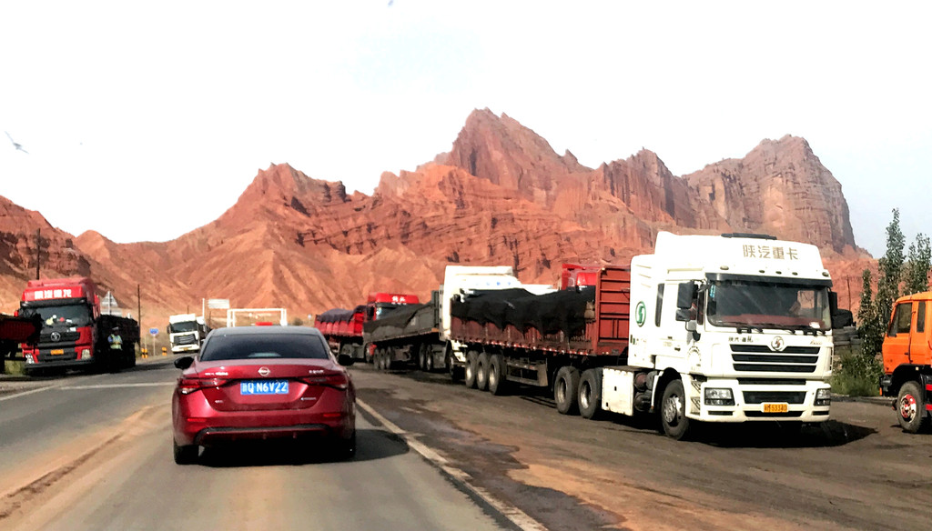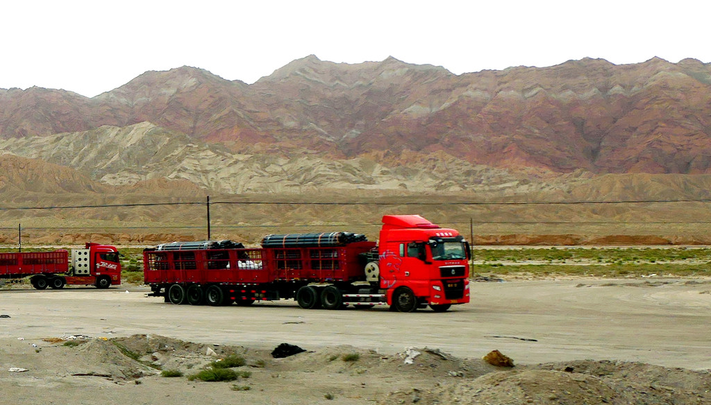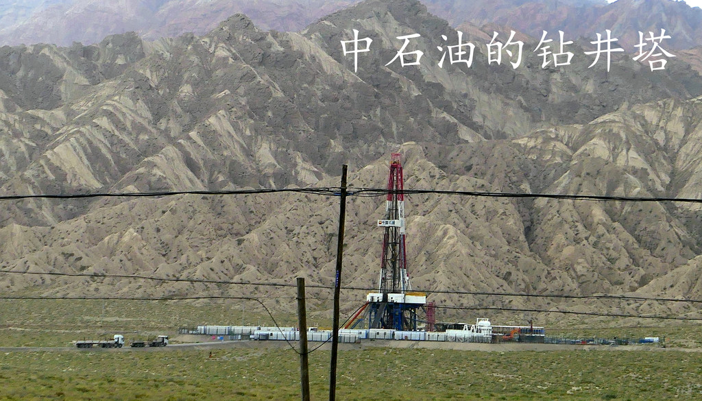 10:25在路边看到了中石油的高大钻井塔。这一路段煤矿甚多,不时可遇拉煤重卡,这也是造成交通拥挤的重要原因之一。独库公路原则上只准7座以下小车通行,唯独这一段,因为道路平直又有煤矿,算是例外。