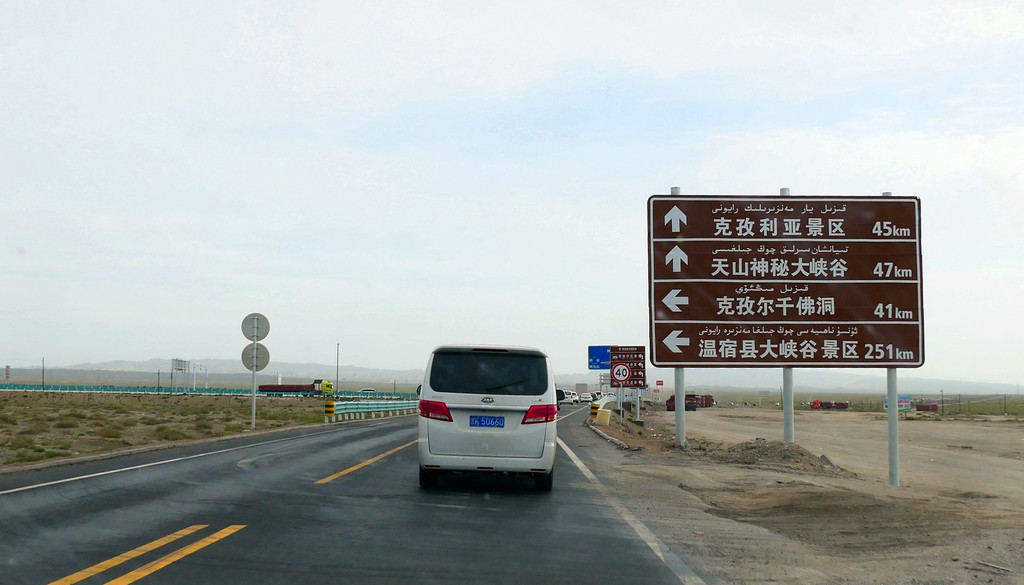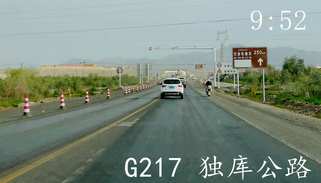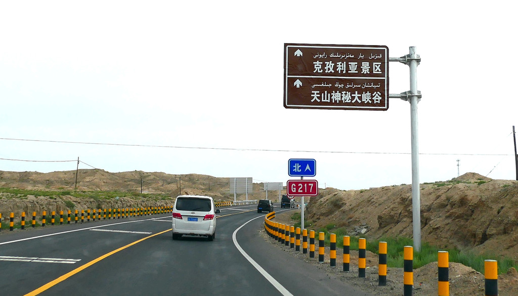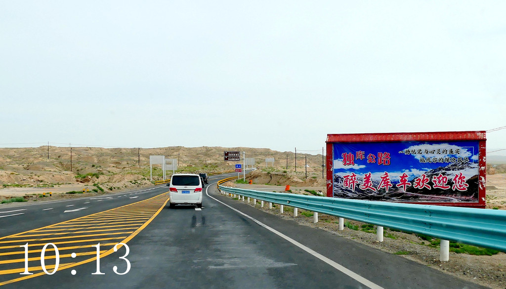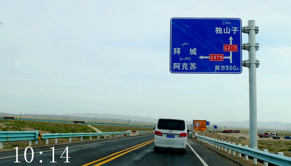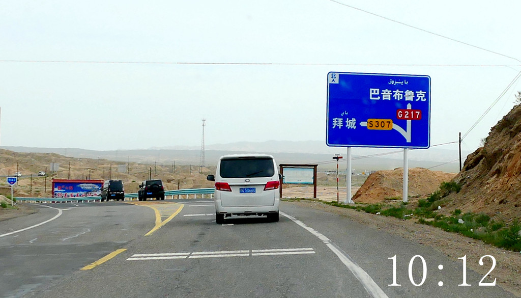 10:13驶经省道S307与独库公路G217交汇的丁字路口,我们昨日就是经由这里从拜城方向前来库车。今日从库车一路开车至此,都算是昨日走过的老途,从这里继续向前,就全都是我俩从未走过的新路。