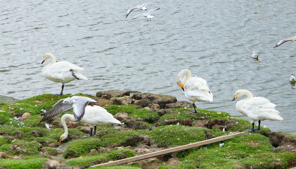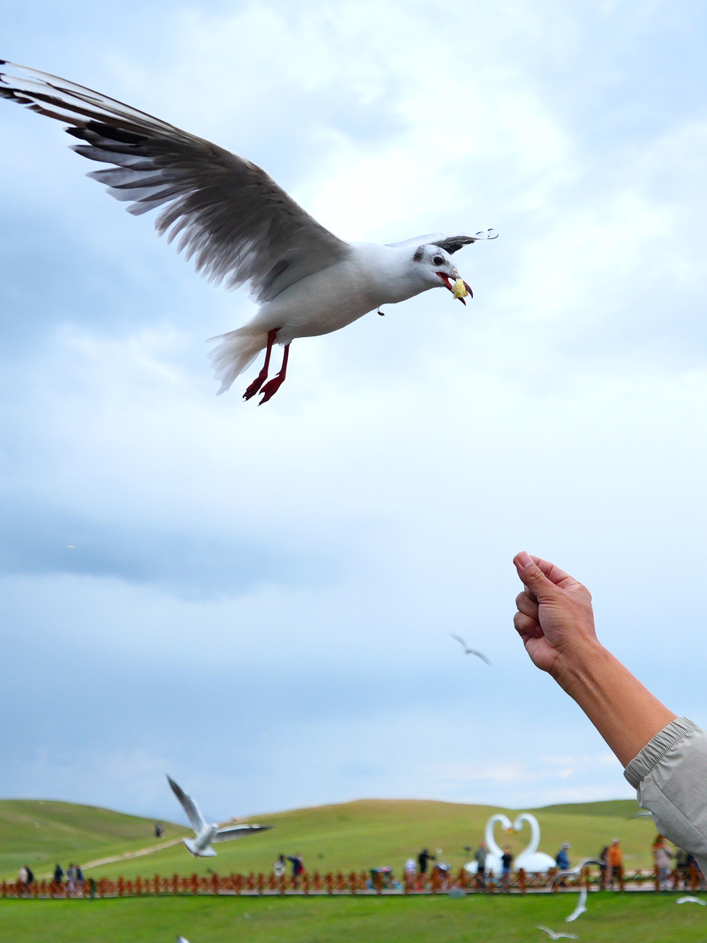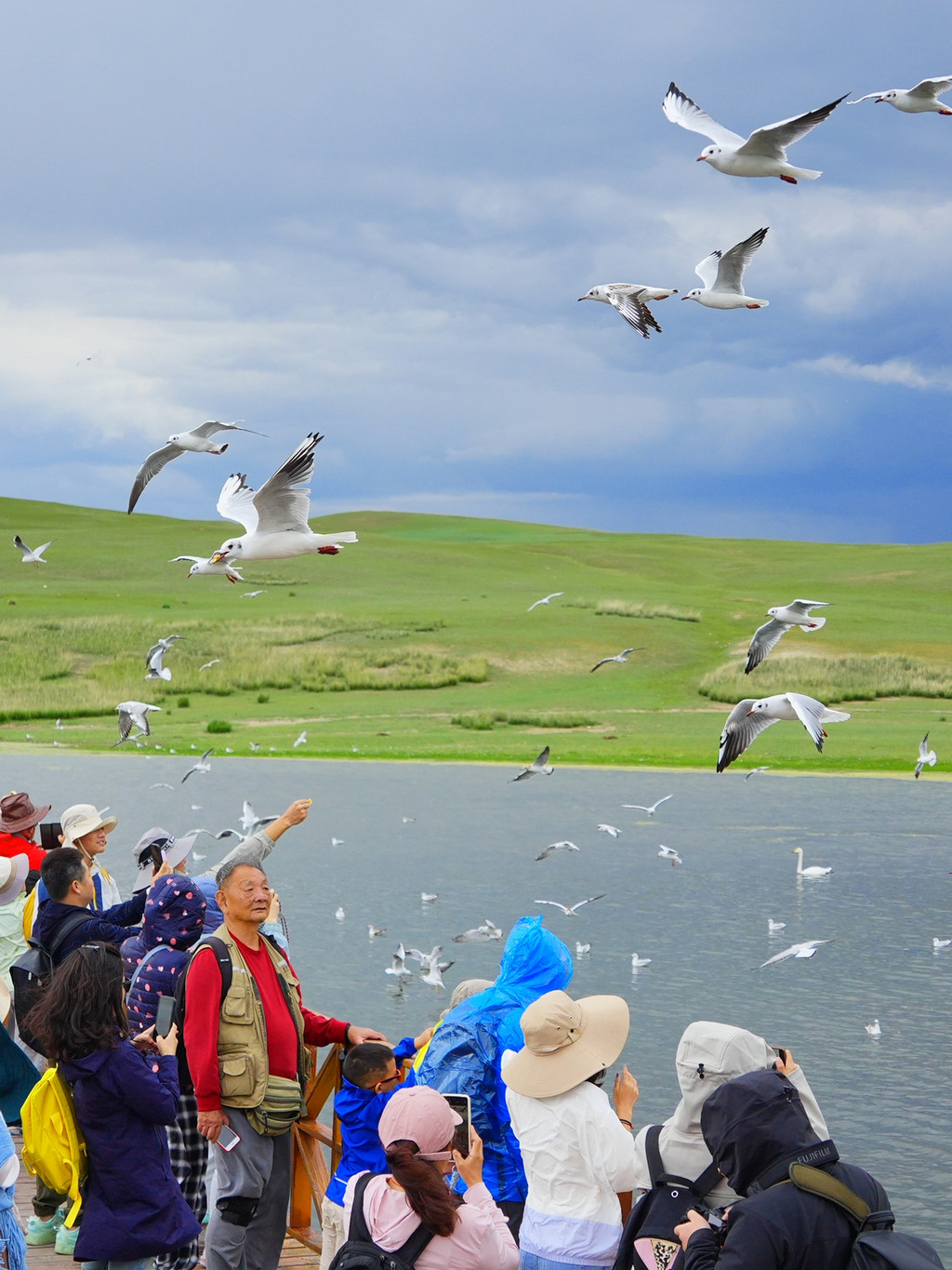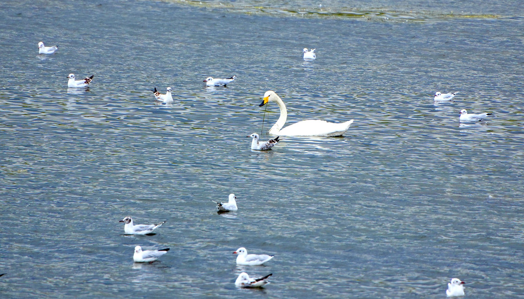 区间车首站天鹅湖,下车后,需沿木栈道行走许久方能到达景点。景区地处巴音布鲁克草原腹地,是亚洲最大、中国唯一的天鹅自然保护区,有着中国最大的野生天鹅种群。这里平均海拔 2400 米,总面积约1100平方公里,由众多蜿蜒曲折的湖泊构成。不过,当下可供游客游览仅为景区内的一座小小湖泊,湖面上也有木栈道,游客可沿栈道走入湖心,近距离地观赏湖中飞鸟。但此刻所见,绝大多数都是国内各地常见之红嘴鸥,天鹅仅有寥寥十几只。而且,只有红嘴鸥乐意亲近游客,接受投喂。白天鹅则是远远避开人群,尽显高傲、优雅之态。