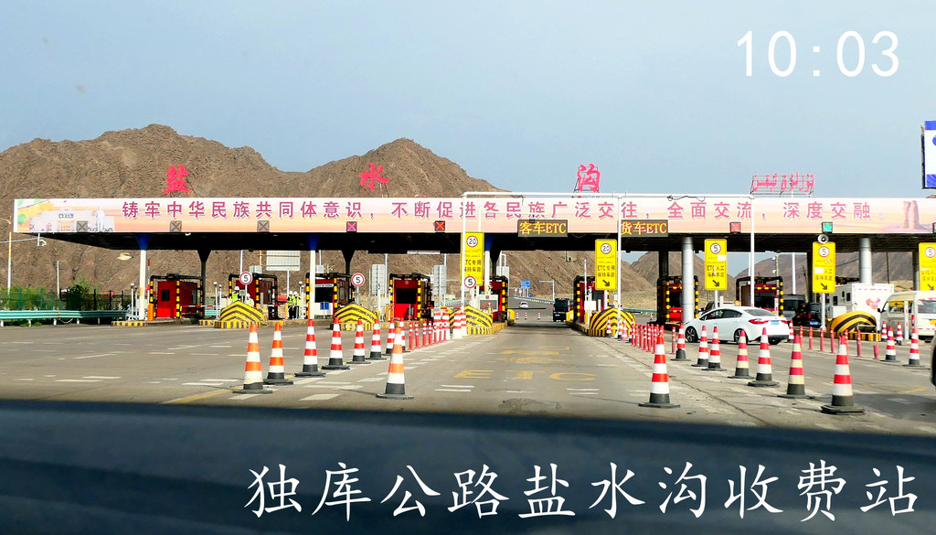 10:03通过盐水沟收费站,随即驶入独库公路“盐水沟景区”路段。路边设有开阔平台,可供停车观景。盐水沟地处天山支脉却勒塔格山,因沟水含盐量高而得名。公路沿沟穿凿山体,沿途怪石嶙峋、片岩层叠,令人目不暇接。