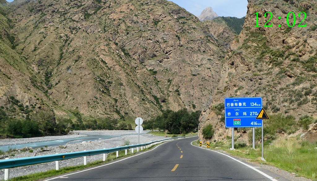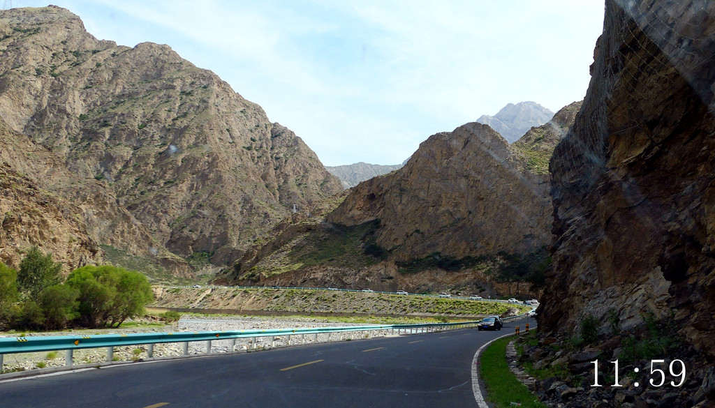 在此以前,我们所走的公路都是沿着一条宽阔河滩修建,河水在道路的右侧流淌,它在不同地段有不同的名称,最初称“库车琼萨依”,过天山大峡谷改称“克格拉克厄肯”,此刻又叫做“卡尔脑”河。河道也从公路的右侧变更到左侧,视野中出现了典型的高山峡谷景观。