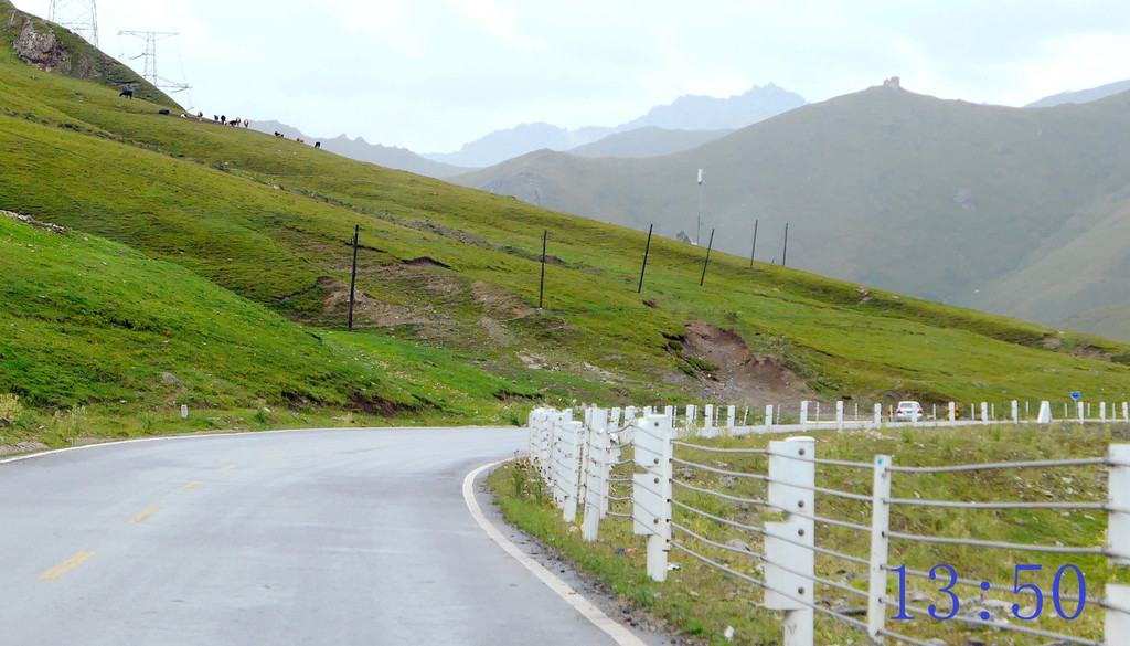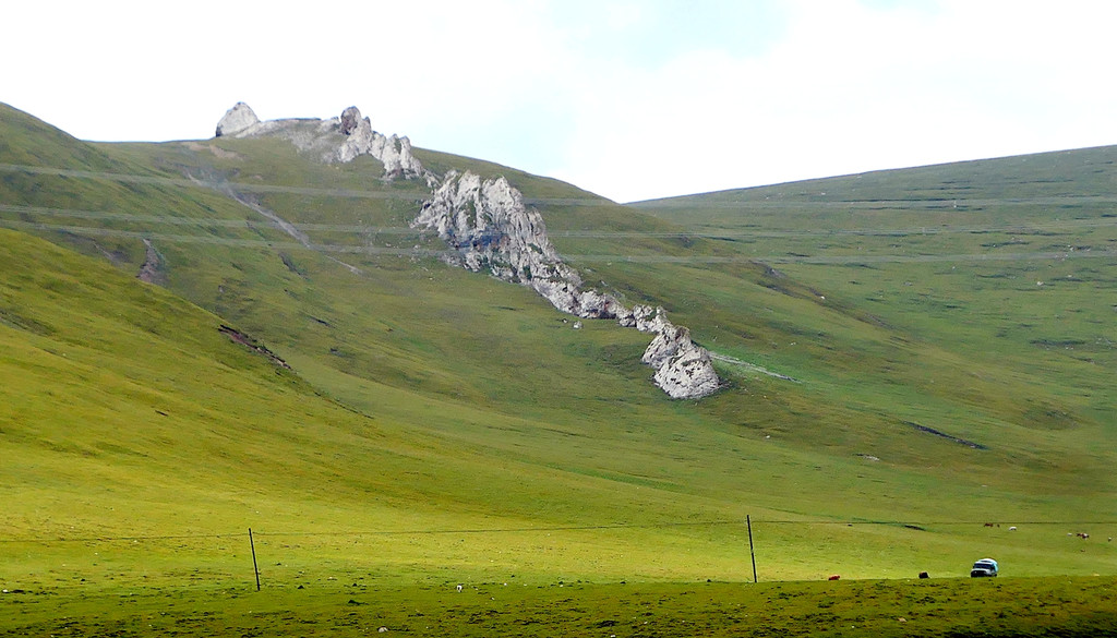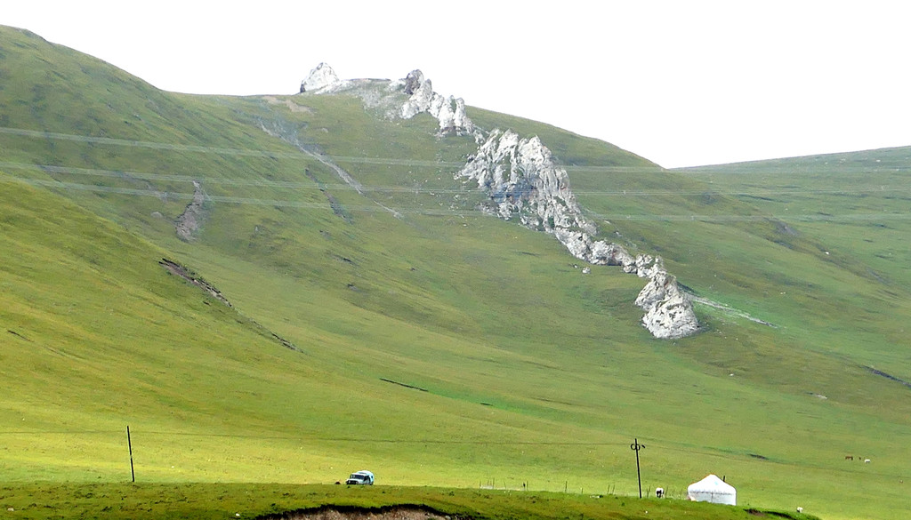 行至14:08 ,不经意间突然发现,公路右侧竟似有条白色巨蟒正从山顶俯冲而下,急忙停车细看,方才确认那只是一道因白色山岩裸露而自然形成的石墙。此处周边皆为缓坡丘陵,芳草萋萋,满眼翠绿,山坡上看不到任何裸露的岩石,相比之下,这道白石长墙就显得格外醒目。刹那间,“白蛇传”的故事涌上心头,再联想到著名电视剧《新白娘子传奇》的主题曲,我们将此“白蛇下山”之奇景戏称为“千年等一回”。
