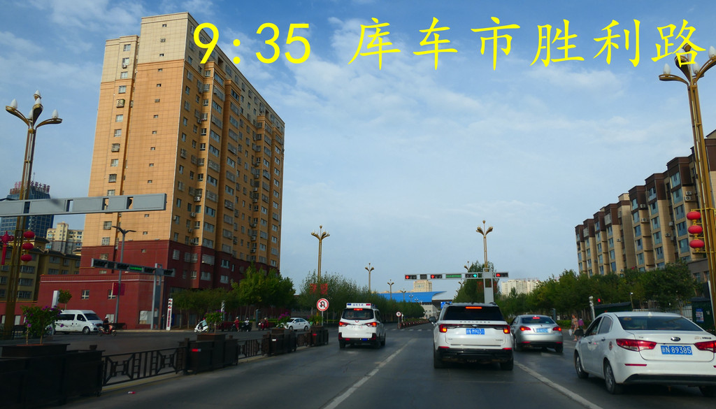 胜利路有很长一段都是农田、农村,路旁是两排高大的杨树。福洋路直接与独库公路连通,应该算是库车市的门面,道路整洁、漂亮。10:00驶经独库公路上的金字塔自然旅游区(雅丹地貌景点),直驶而过,此处有座“独库公路终点”碑石,我们昨日曾在那里稍停。