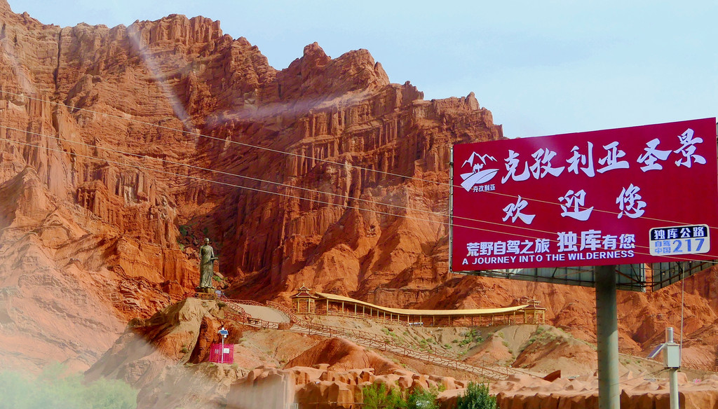 这里已是著名“天山神秘大峡谷”的外围,该峡谷又称克孜利亚大峡谷,系由红褐色的巨型山体群组成,在维吾尔语中,“克孜利亚”意为红色山崖。10:58驶经“克孜利亚圣景”,路边站立一尊高大的佛像,据说内有一座唐代石窟。