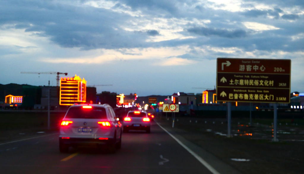 在停车场上找到自己的汽车后立即出发,我们今晚是要到那拉提镇过夜,X.J.已经预定了镇上的酒店。从巴音布鲁克到那拉提须行车2小时,抵达应该是在23点左右。新疆是22点左右天黑,我们已无法在天黑以前赶到那拉提。此情违背了我们尽量不赶夜路的自驾出游原则,但这也无可奈何,因为我们大大低估了在巴音布鲁景区克逗留的时间。