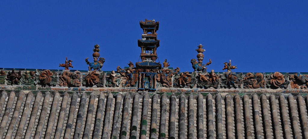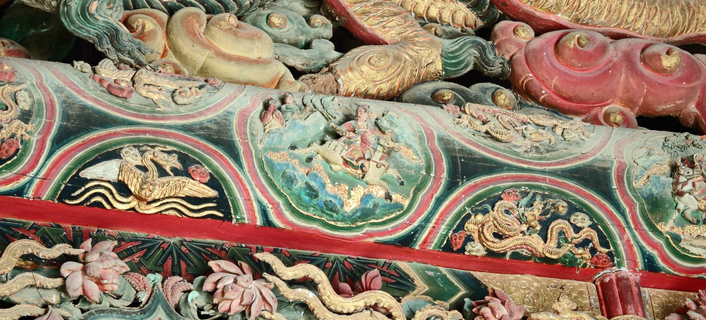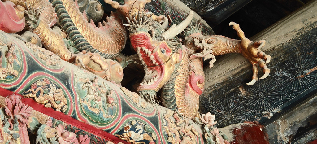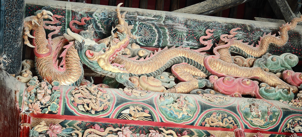 稷益庙除了精美的壁画外,它梁上悬塑也是一大看点,两条金光闪闪的五爪金龙,分列两边;