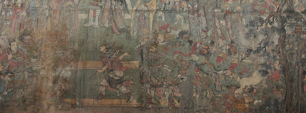 来之前,我做了功课,里面有一幅捕蝗图很出名,这次就是想看看这个。稷益庙内东西墙面画满了壁画,著名捕蝗图就位于东侧,一个魁梧的红衣农夫死死抱住与人齐高蝗虫精,怒目圆睁,而蝗虫精两只脚爪,用力狠蹬地面,张开嘴,一副努力向前挣脱样子,旁边白衣抽紧绑在蝗虫精身上的绳,也是用尽力气。两人身后戴圆帽的男子,捧着一个竹笼,很紧张地看两人的动作,生怕蝗虫精逃脱,旁边几位老人也在旁观,其中一位老妇人合掌念念有词,祈求两位农夫能制服蝗虫精。