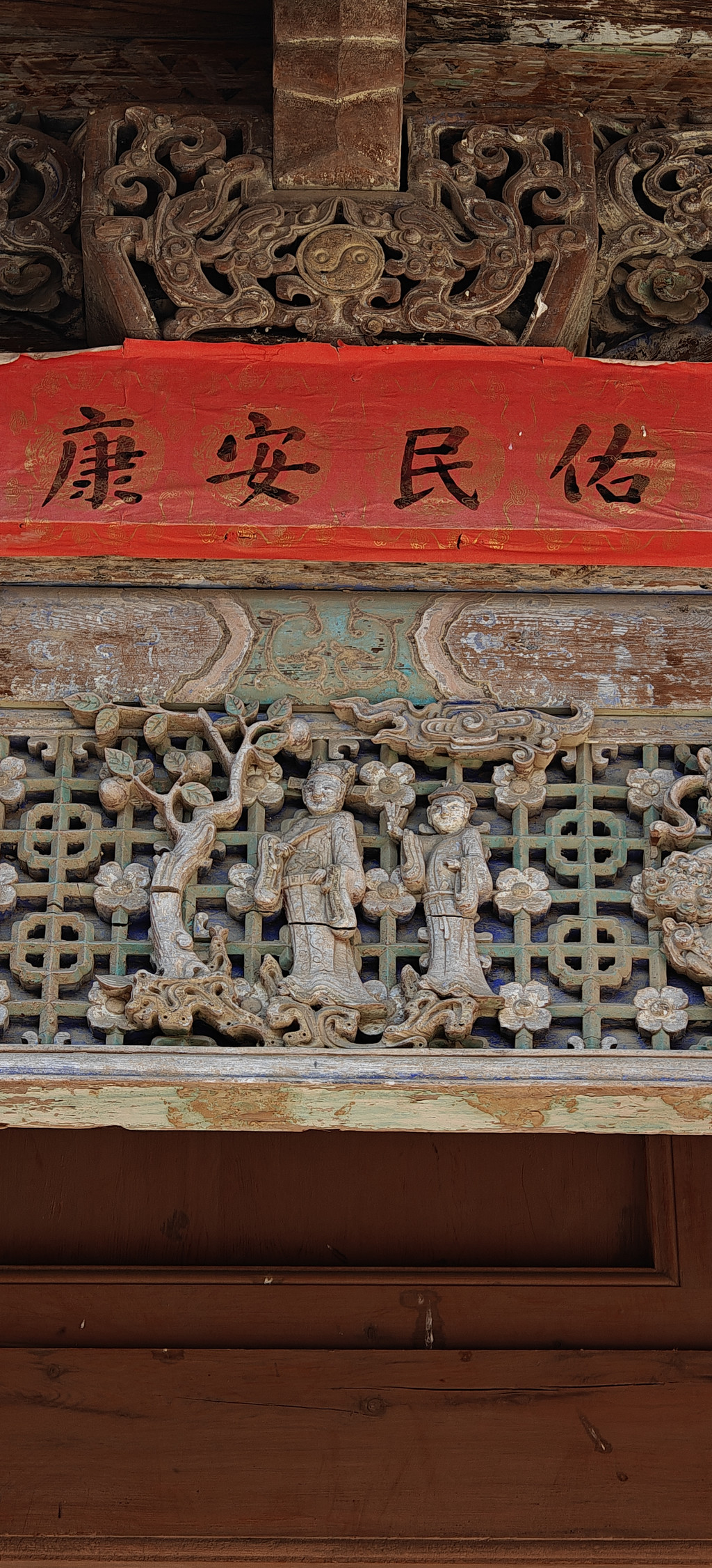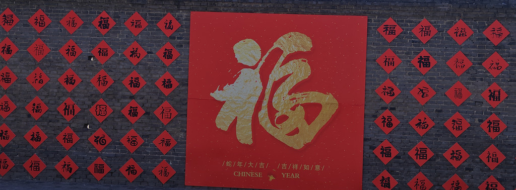 稷益庙位于阳王镇的一小村落里面,这一天是年初六,庙前戏台用金色的布包起来,墙上贴有百福。非常有喜庆气氛!小庙外表很普通,但里面却是让我们意外惊喜!