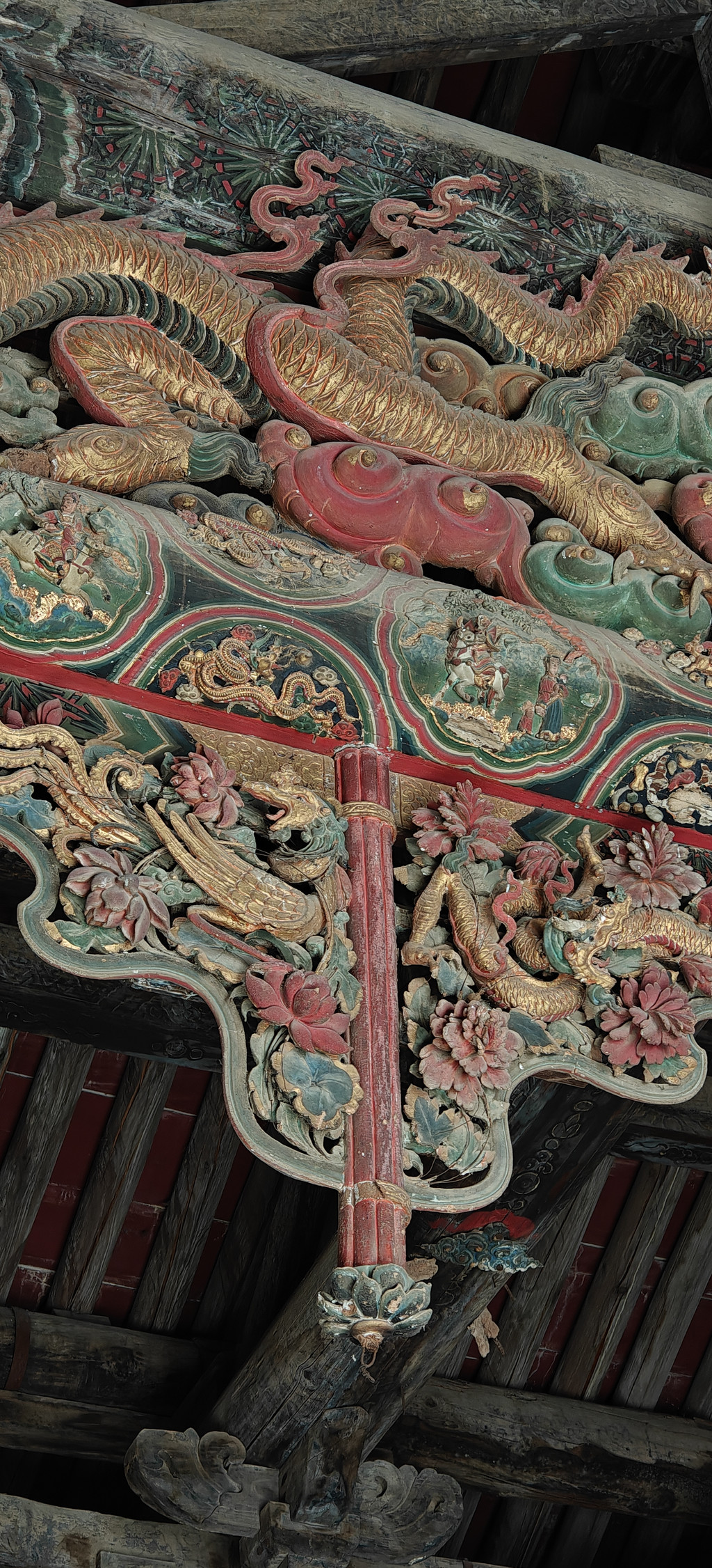 中间好几条小龙,上下飞舞;梁上还有精美的人物彩画,令人叹为观止!