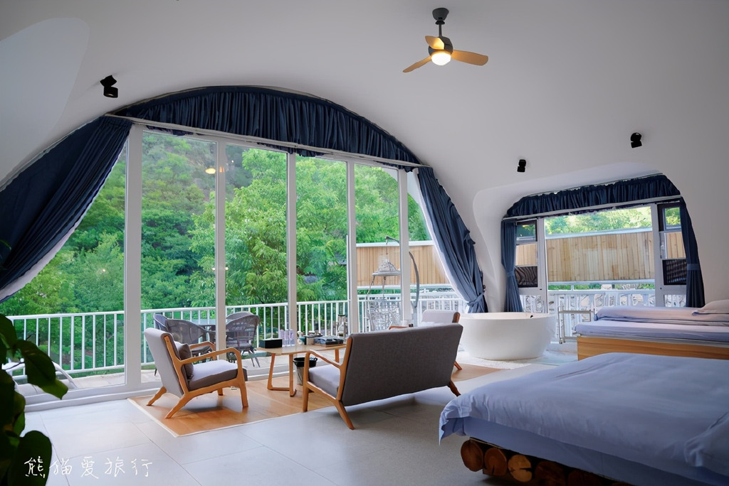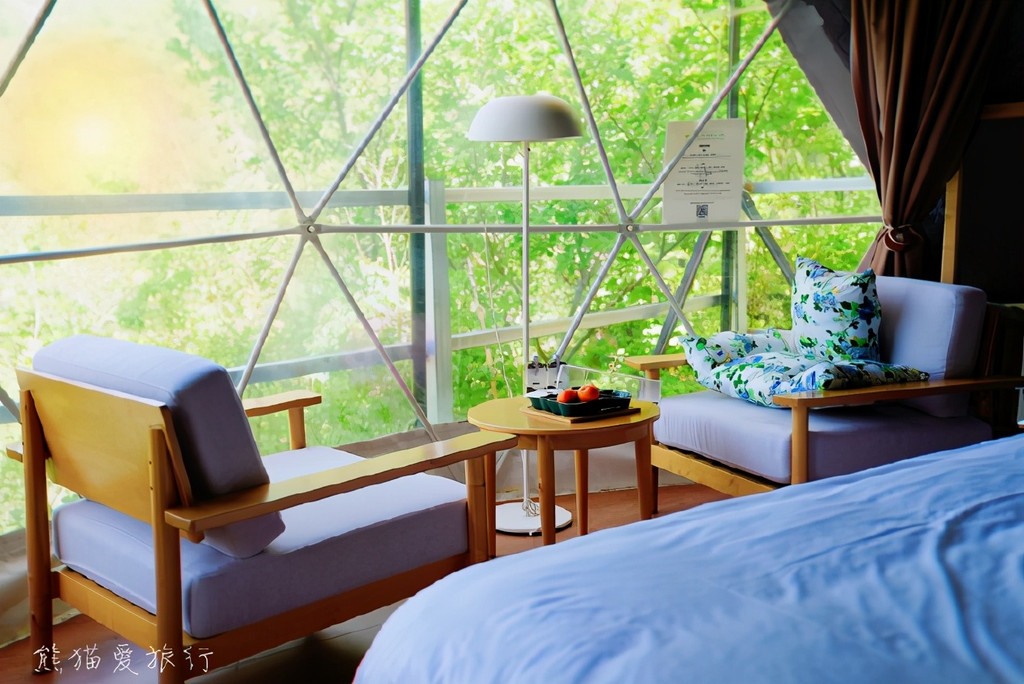 6米直径的泡泡屋内部温馨又宽敞,床后面的区域是卫生间、浴室和洗漱台,私密又方便。除了1.8米的舒适大床,还有立式空调、贴近泡泡透明落地窗的座椅。可以坐在泡泡屋的落地窗前喝着民宿自制的冷泡茶看风景,也可以坐在每一个泡泡屋都拥有的私家露台上感受清风。不必担心行李,工作人员会第一时间将所有行李放进房间。