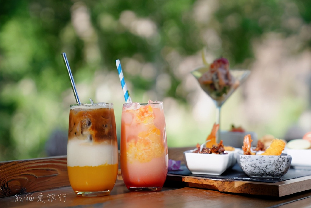 午后的时光,推荐来鹿隐西餐厅,光线透过白桦林洒在长条木桌上,听着铸铁风铃声和潺潺流水声,坐在可以望见森林的高脚凳上,来一份可盐可甜的森林系下午茶!提拉米苏、马卡龙、荔枝奶冻、布朗尼、慕斯蛋糕、蛋挞、虾球丸子、鸡肉春卷、水果冰激凌……难以想象民宿的下午茶都做得如此出色!饮料单品也都好喝得让人停不了口,推荐海岛冰咖、蓝色的海洋、粉红少女心。
