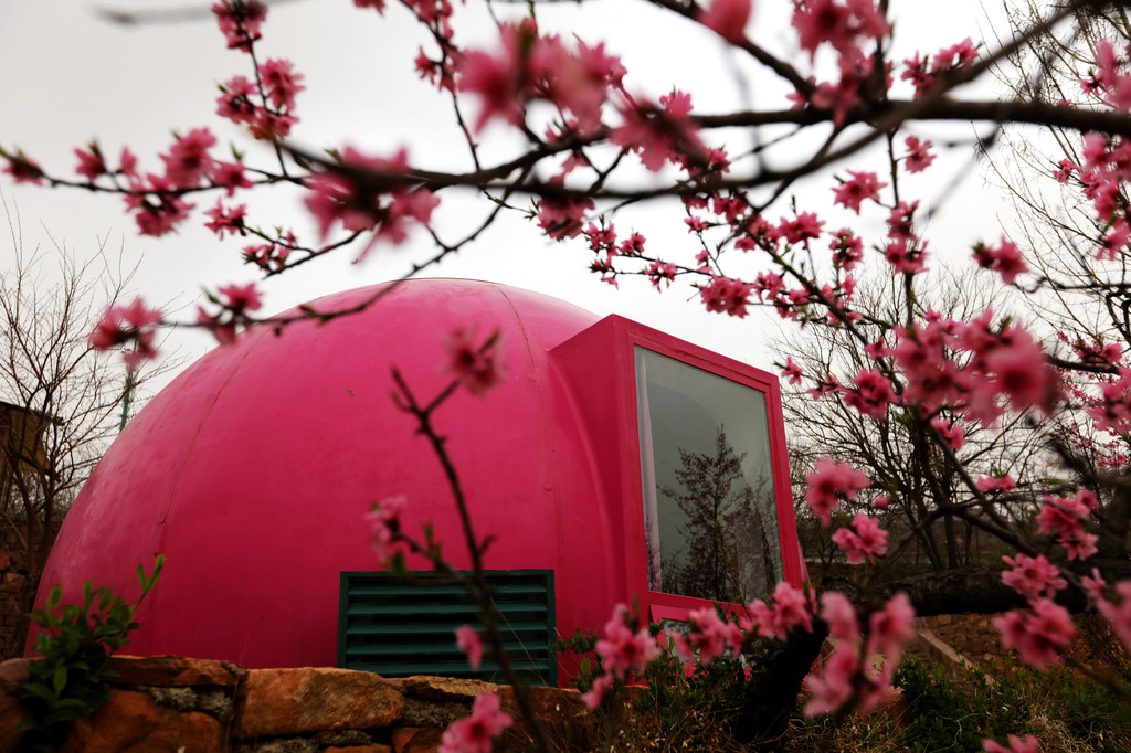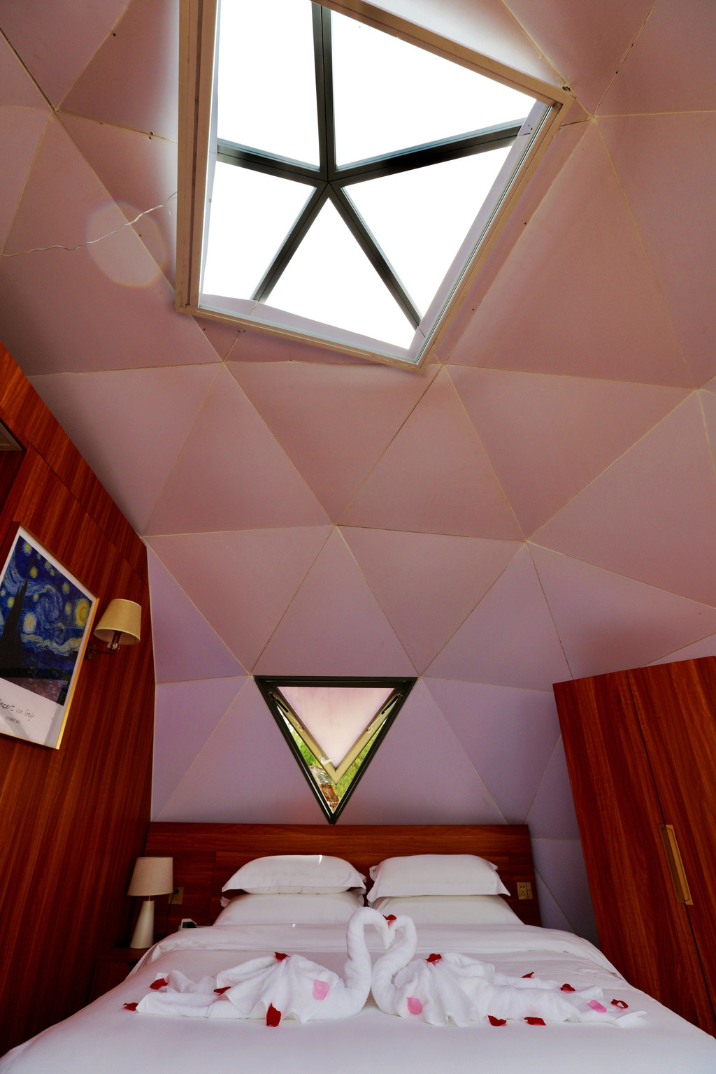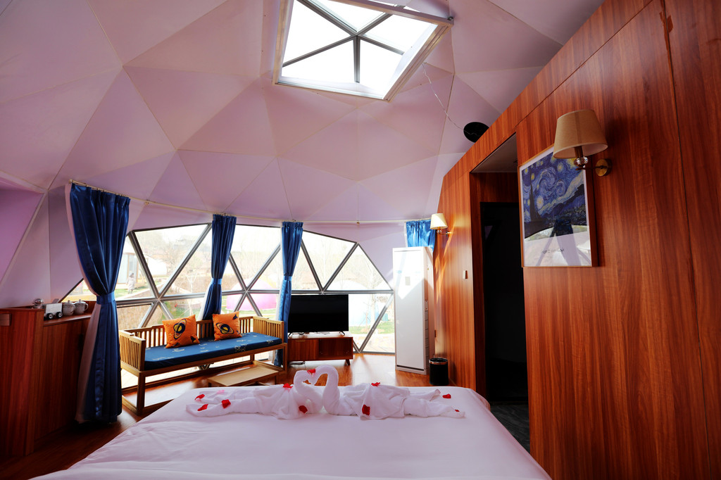 树影婆娑、红花掩映,星空营地里的主题客房间由木栈道连接既能互通又能独立,走进小屋,屋内配套齐全,最大的亮点就是玻璃房,天气好时,白天是阳光房,晚上透过屋顶的小窗就成为星空房,浩瀚星空尽收眼底。