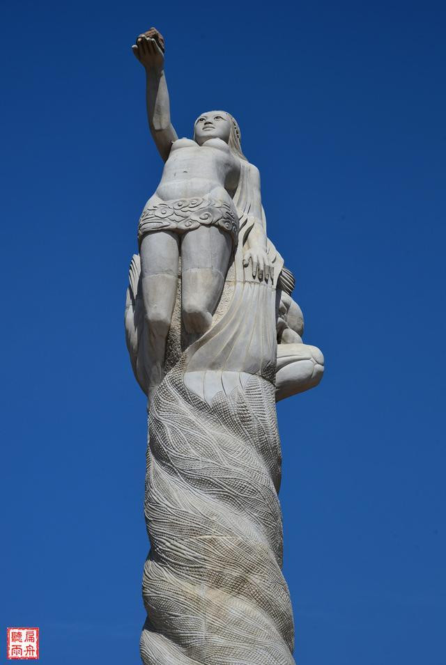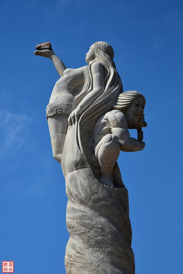 雕塑的介绍说这是伏羲与女娲的交尾塔。塔身通体洁白,女娲面南,挺胸抬头,手擎七彩补天石;伏羲面北,手捧八卦阴阳石,弯腰弓背,支撑着女娲向天补阙的无畏气概;男神和女神的蛇尾相互扭结缠绕,共同缔造了华夏文明和华夏民族。