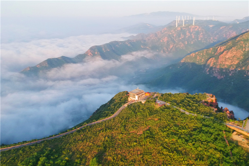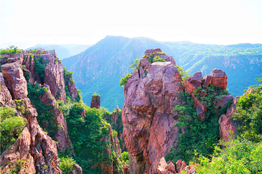 在红石林景区俯瞰,我们可以看到一条曲折蜿蜒的山路在绿意葱茏的山间盘旋,这条公路被郑州人称为最美公路,一路自驾,山势连绵起伏,风景美不胜收。