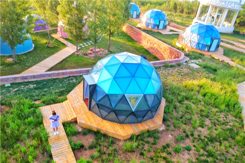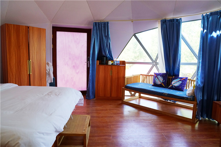 山林之间的星空营地,有玻璃房、石头房、贝壳房、星空房,错落有致地分布在青山绿水之间,我住的蓝色玻璃房,可以180度欣赏山野间的风景,清晨推开窗户,就是蔓延的绿色。