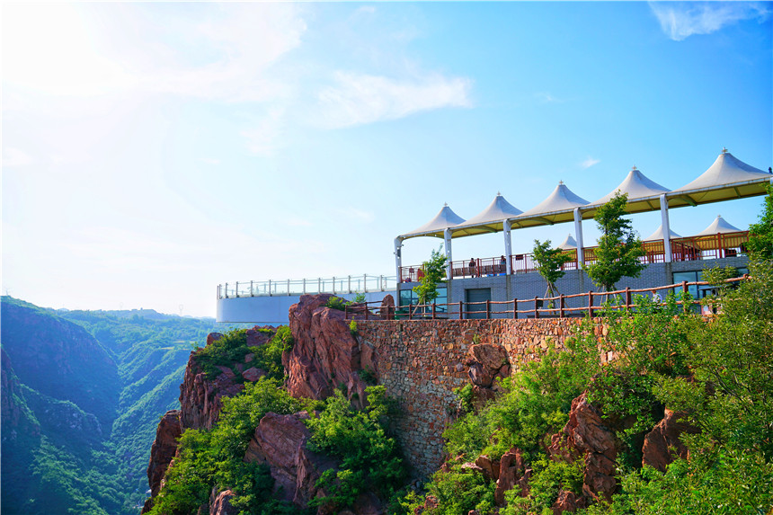 位于伏羲山的红石林景区内有个环形玻璃栈道,整个是修筑在高出地面360米的山上,使用了3000多吨工程钢建筑而成,比美国科罗拉多大峡谷玻璃环廊栈道还要长9米,这里也是每个来到伏羲山游玩的游客都会来打卡的地方。